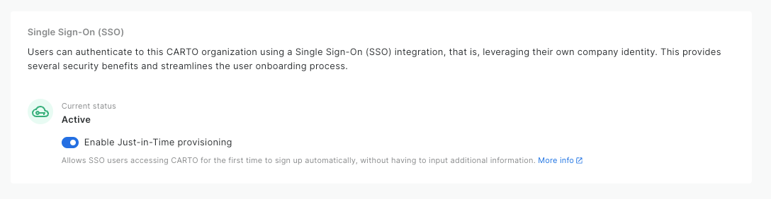 When SSO is enabled, you can configure CARTO to create users as soon as they successfully log in for the first time using your IdP login flow, without any additional steps or signup questions. We call this process **Just-in-time provisioning.** Check our documentation to learn [how to configure Just-in-time provisioning in CARTO Workspace](https://docs.carto.com/carto-user-manual/settings/sso#just-in-time-provisioning).
