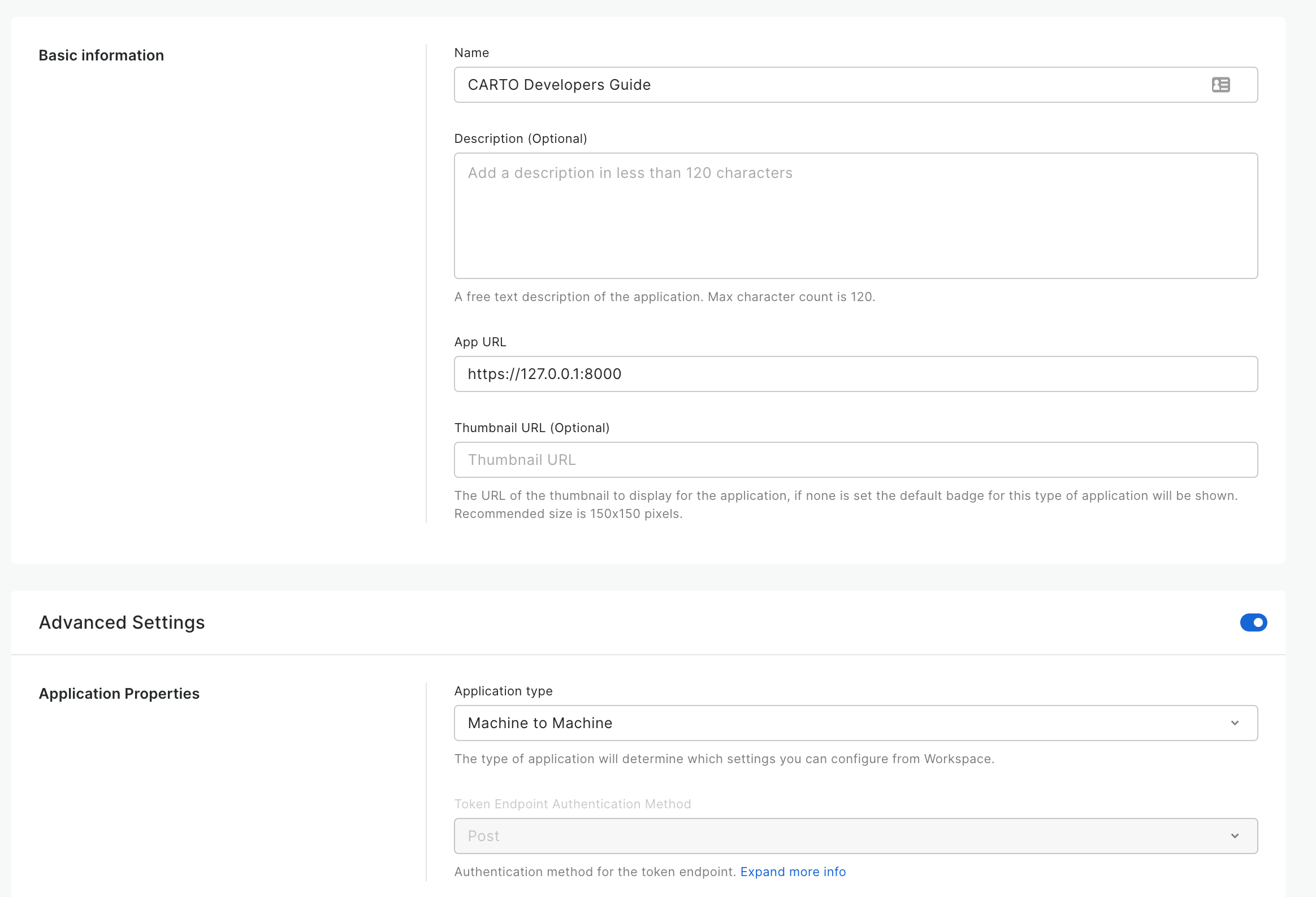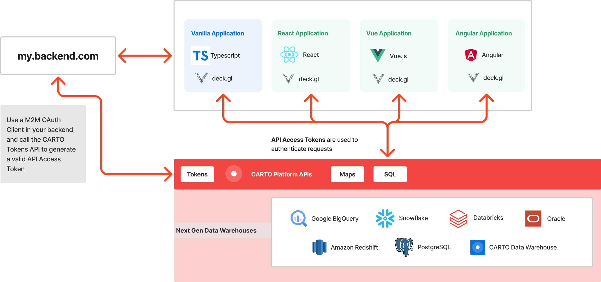 In this guide you will learn how to integrate CARTO with an existing application that has its own login system, implementing the machine-to-machine authentication in order to provide fine-grained data access to the end users.