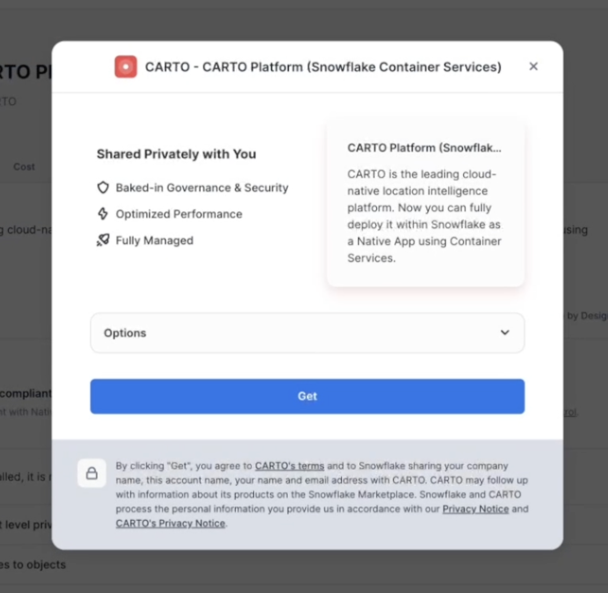 To begin with the installation, simply open the CARTO private share and click on Get. You'll be asked which *warehouse* the app will use.
