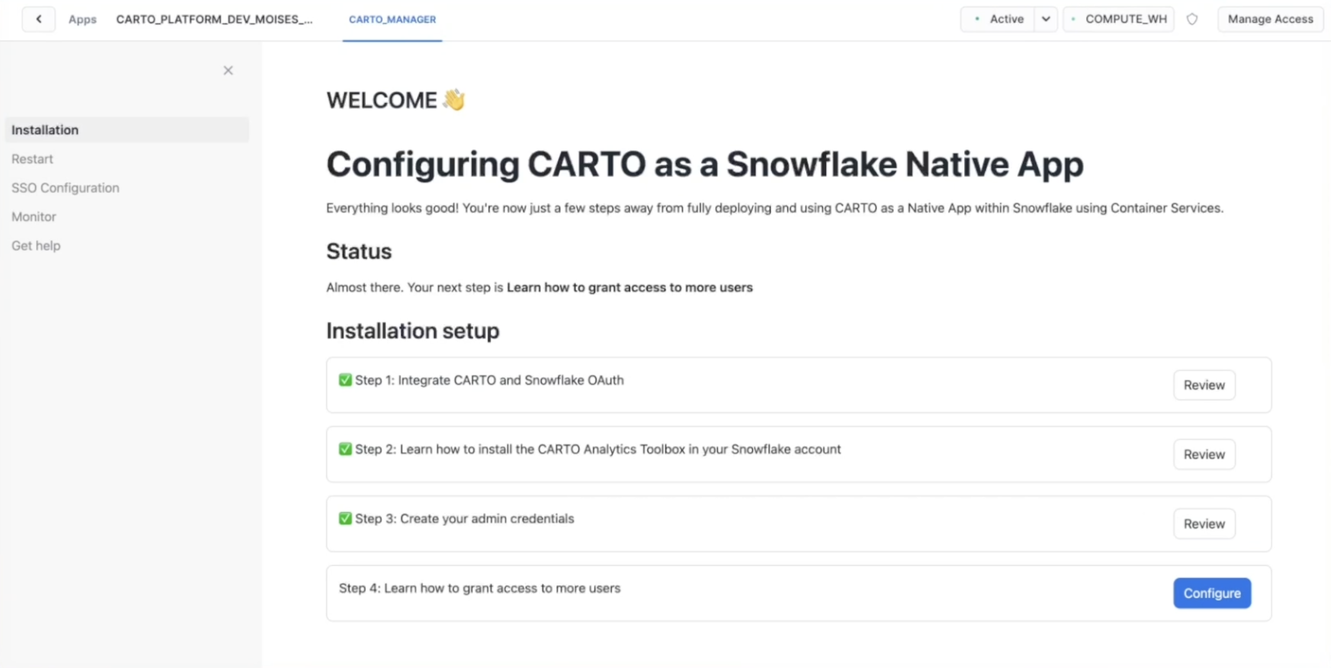Once you click on Configure, the Snowflake control panel of the app will open. There are some steps that you need to complete before launching CARTO for the first time: