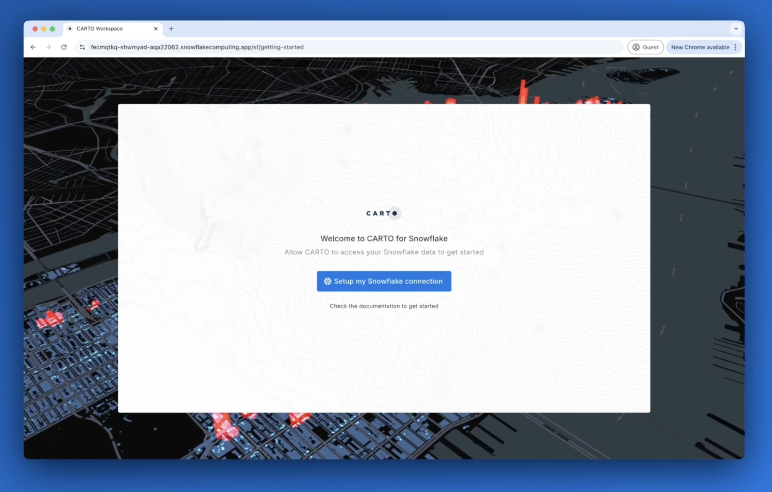 Congrats! Click on "Connect" and you'll be taken to **CARTO** **Workspace** where you can start using CARTO fully deployed inside Snowflake 🎉