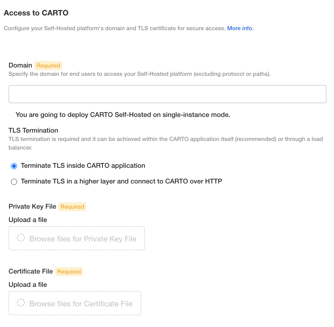The CARTO platform necessitates a valid SSL certificate tailored to your domain to ensure secure communication and data transfer. Depending on your architecture, you have the flexibility to either terminate TLS within the CARTO application, requiring your SSL certificate, or at a higher layer.