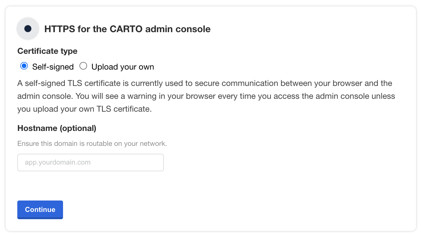 Once the SSL certificate is configured, proceed by clicking the continue button to confirm the configuration of your cluster. You can then begin customizing the settings and features of your CARTO Self-Hosted platform through the Admin Console.