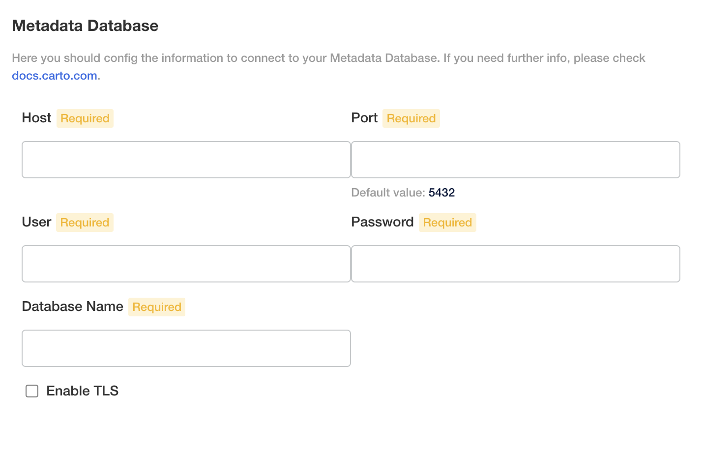 At this point, we are setting up the configuration of the [external database](https://docs.carto.com/key-concepts/deployment-requirements#external-database). You need to provide a PostgreSQL user and a database that can be used by that user to configure the metadata database used by CARTO platform.