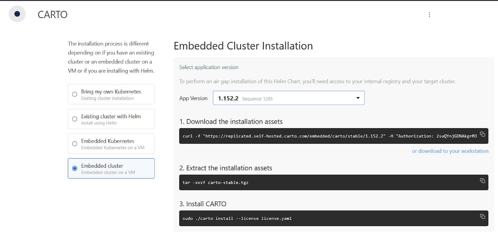 Download the customer package from the URL that shared by CARTO team. **Select the CARTO Embedded Cluster installation** and download the binary.