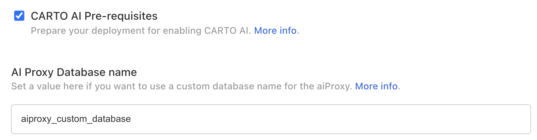 Ensure your PostgreSQL password does not contain URI-special characters (`@`, `#`, `%`, etc.), as the AI Proxy builds database connection URLs internally. See [Deployment Requirements](https://docs.carto.com/key-concepts/deployment-requirements#external-databases) for details.
