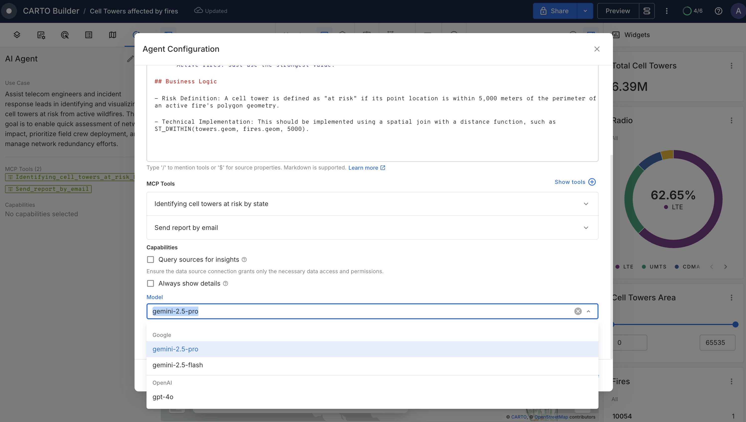 In your Agent configuration, you can select from models made available by your organization through [CARTO AI settings](https://docs.carto.com/carto-user-manual/settings/carto-ai).
