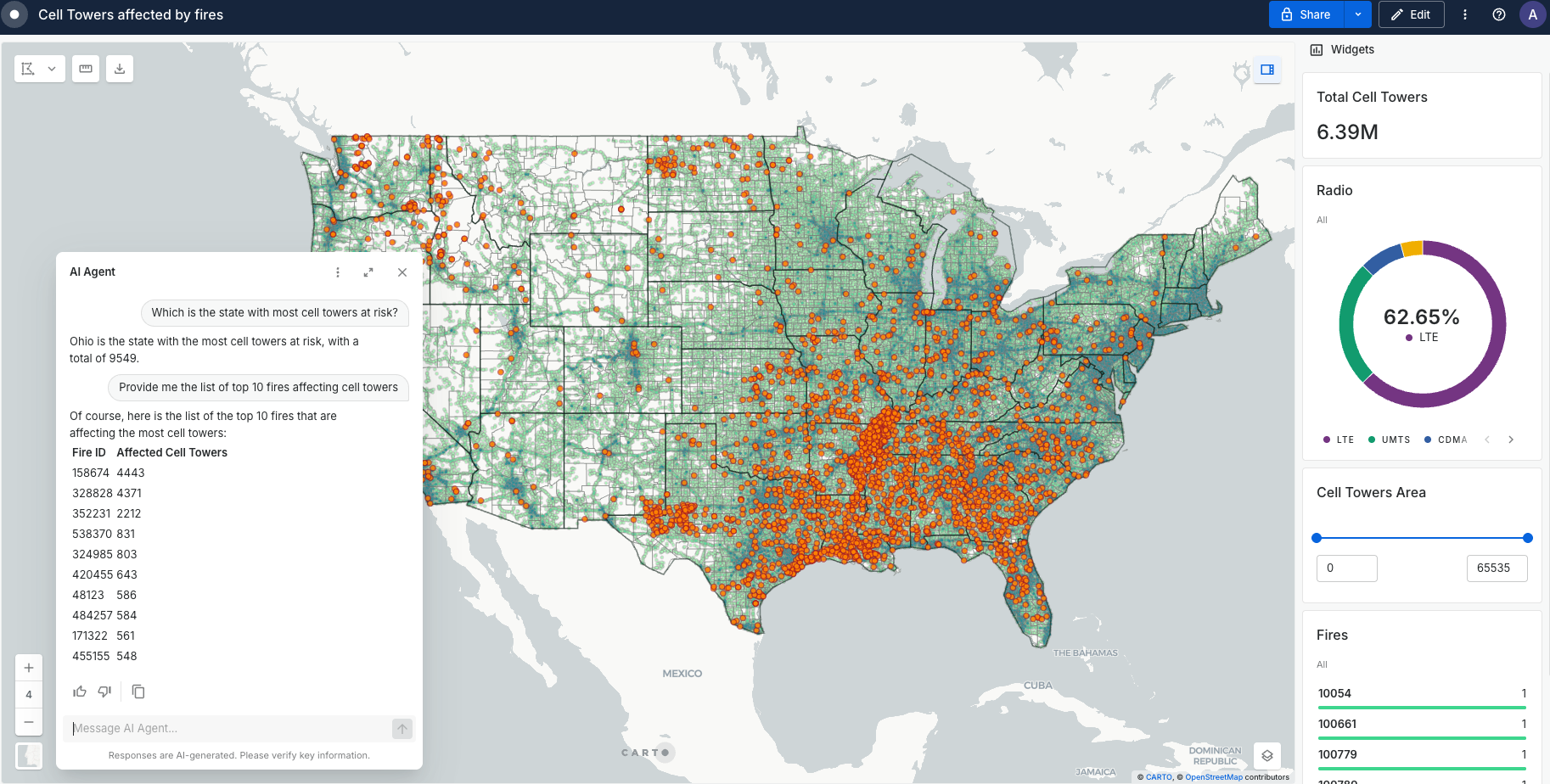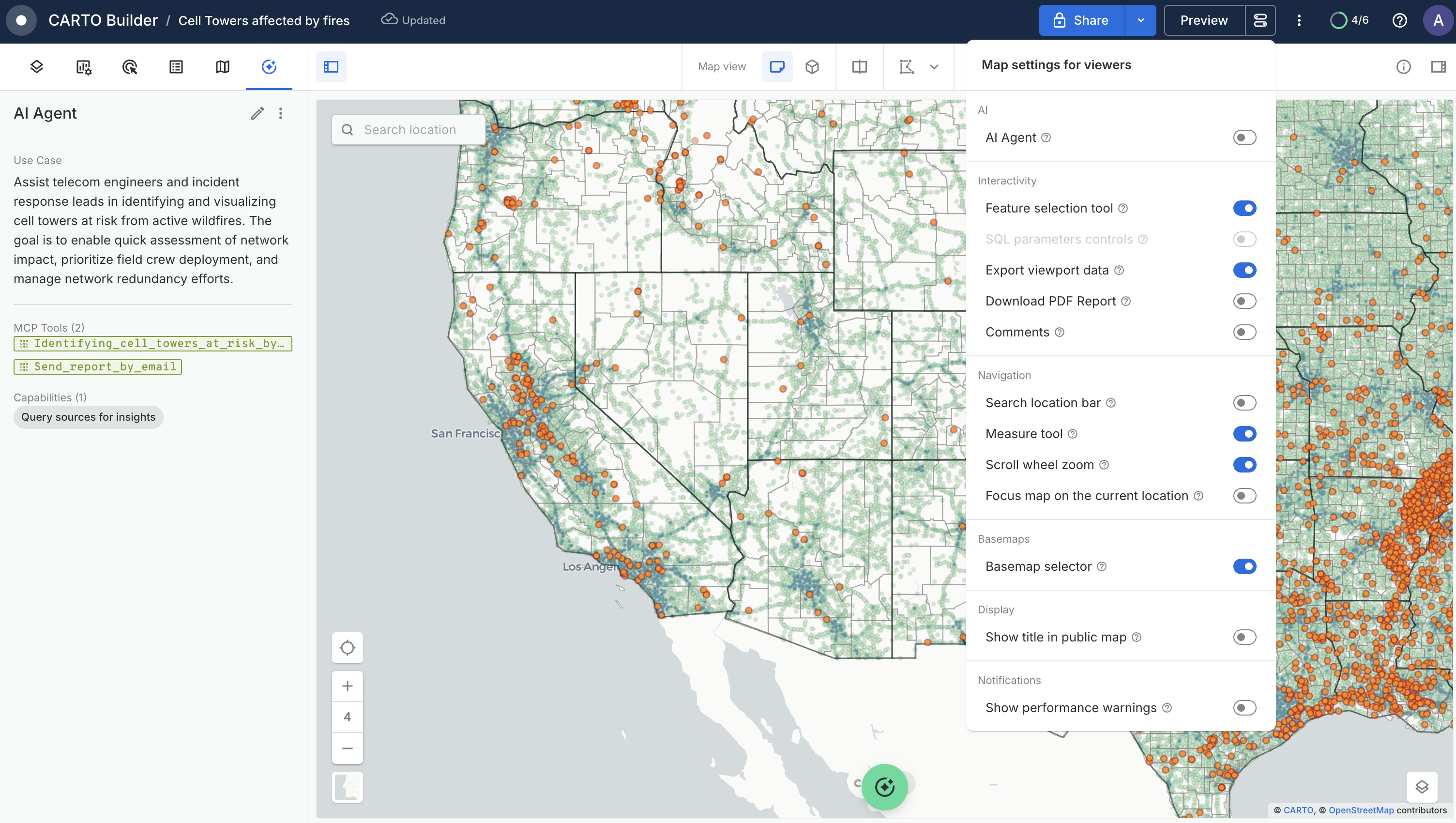 After confirming everything looks good, you can share your map using CARTO's sharing options. This will make both the map and the integrated AI Agent available to your chosen audience, whether it's specific colleagues, your entire organization, or the public.