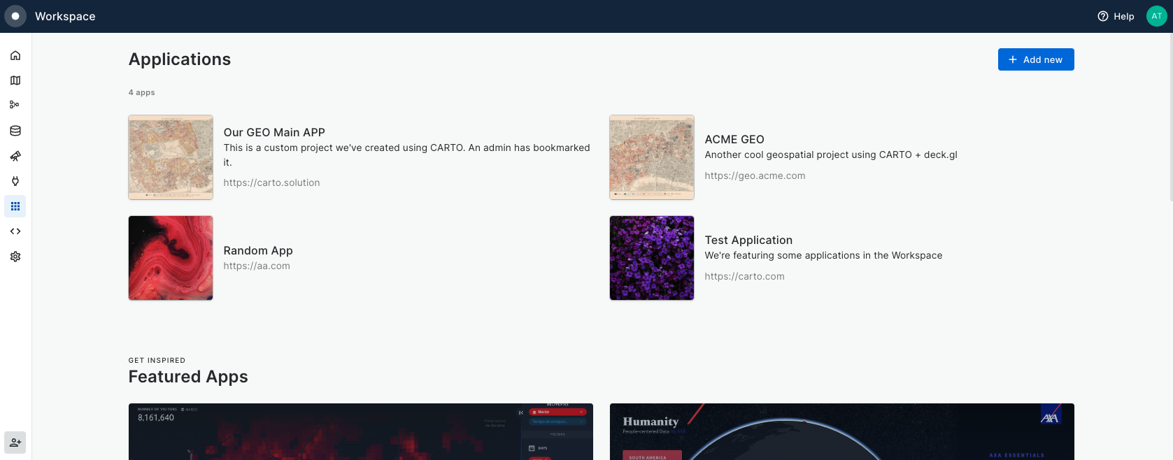You can think of the "Applications" section as a place to bookmark geospatial solutions that are relevant to your end users in CARTO.