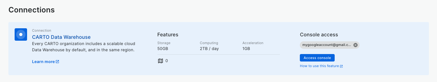 The `CARTO Data Warehouse` connection is limited to a certain amount of computing per day. You can find this limit in the `CARTO Data Warehouse` connection’s card. These limits depend on whether your organization has purchased the CARTO Data Warehouse Add-on in your subscription plan.