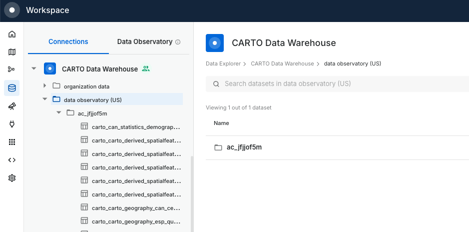 Inside the CARTO Data Warehouse > Organization Data you will find the `Data Observatory (US)` dataset. This dataset will contain all the **samples and subscriptions** that you've subscribed to from the [CARTO Data Observatory](https://docs.carto.com/carto-user-manual/data-observatory).