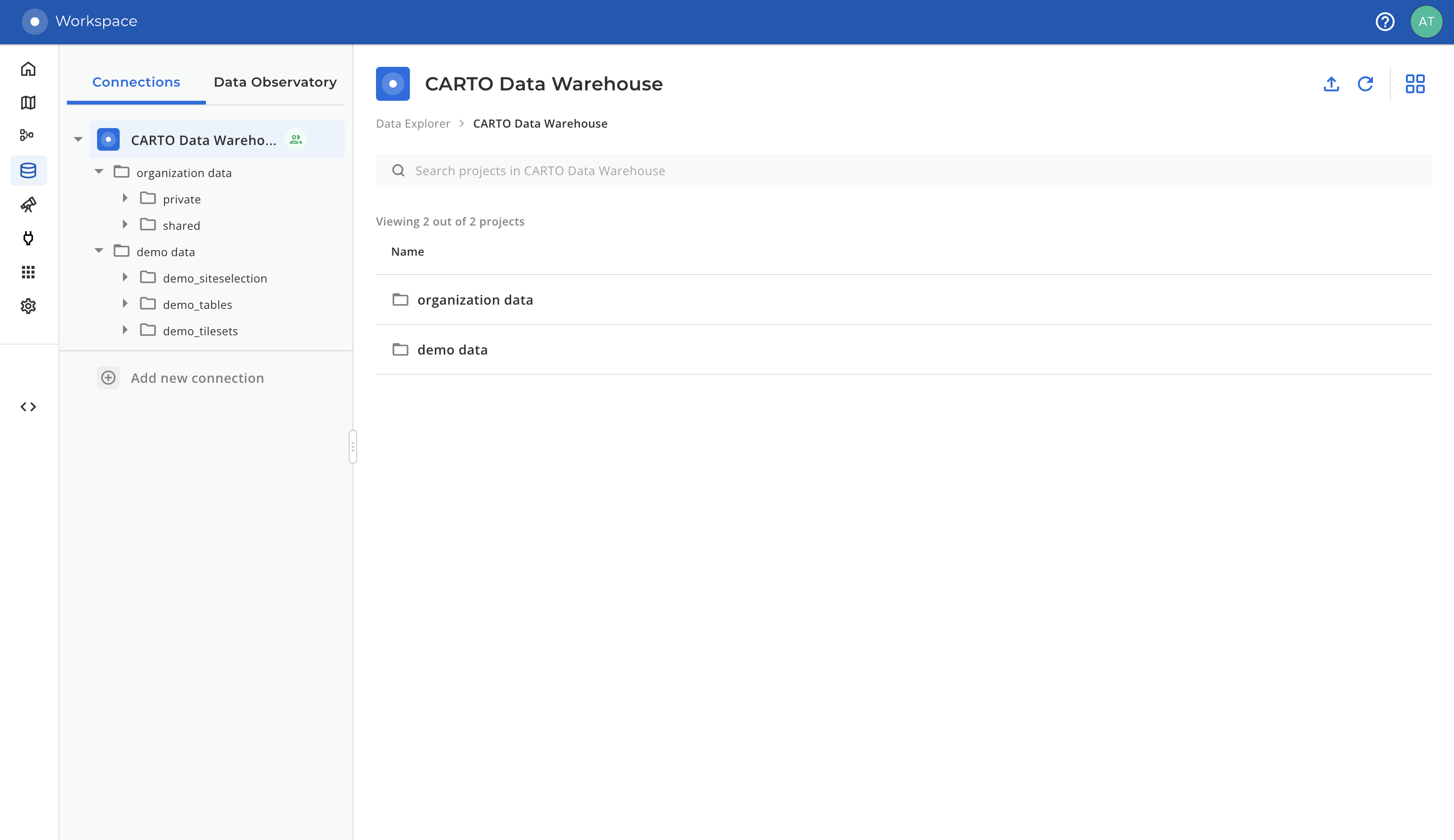 Every CARTO organization comes provisioned with an active data warehouse connection that is created by default.
