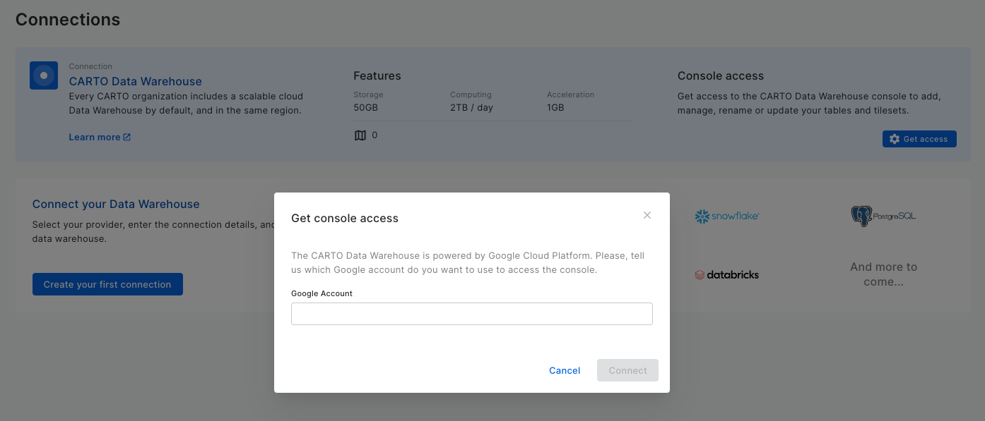 In order to get access to the console of the CARTO Data Warehouse, just provide a valid **Google Account:**