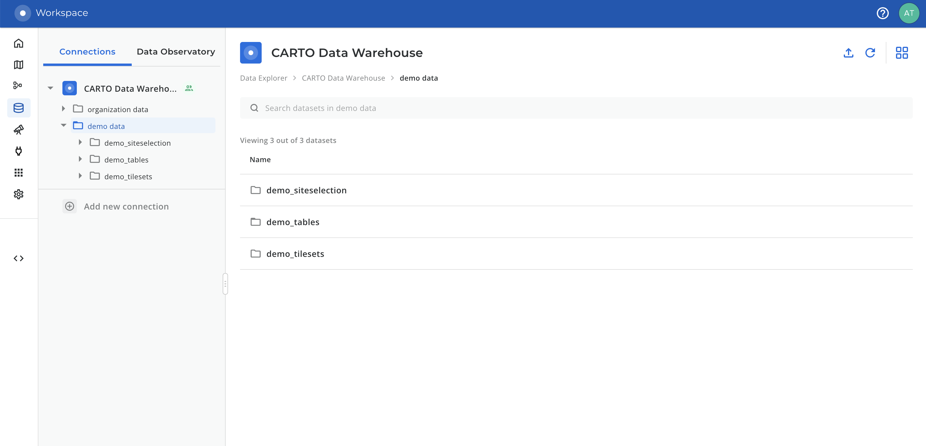 The `CARTO Data Warehouse` connection grants access to a set of demo tables and tilesets that can be used to start creating maps and exploring the tools from the very beginning. They’re available and ready to be used in the Data Explorer.