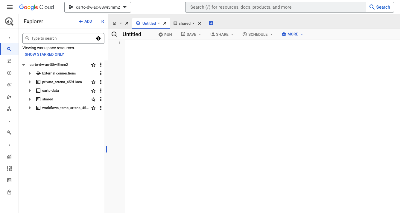 At this point, we have granted your Google account permissions to access the console, plus access to the [**Analytics Toolbox for BigQuery**](https://docs.carto.com/data-and-analysis/analytics-toolbox-for-bigquery), so you can run our functions directly in the console. If you click on *"Access console"* you'll be redirected to the Google BigQuery console, where you will have the same level of access than in the CARTO Data Explorer. You will likely see: