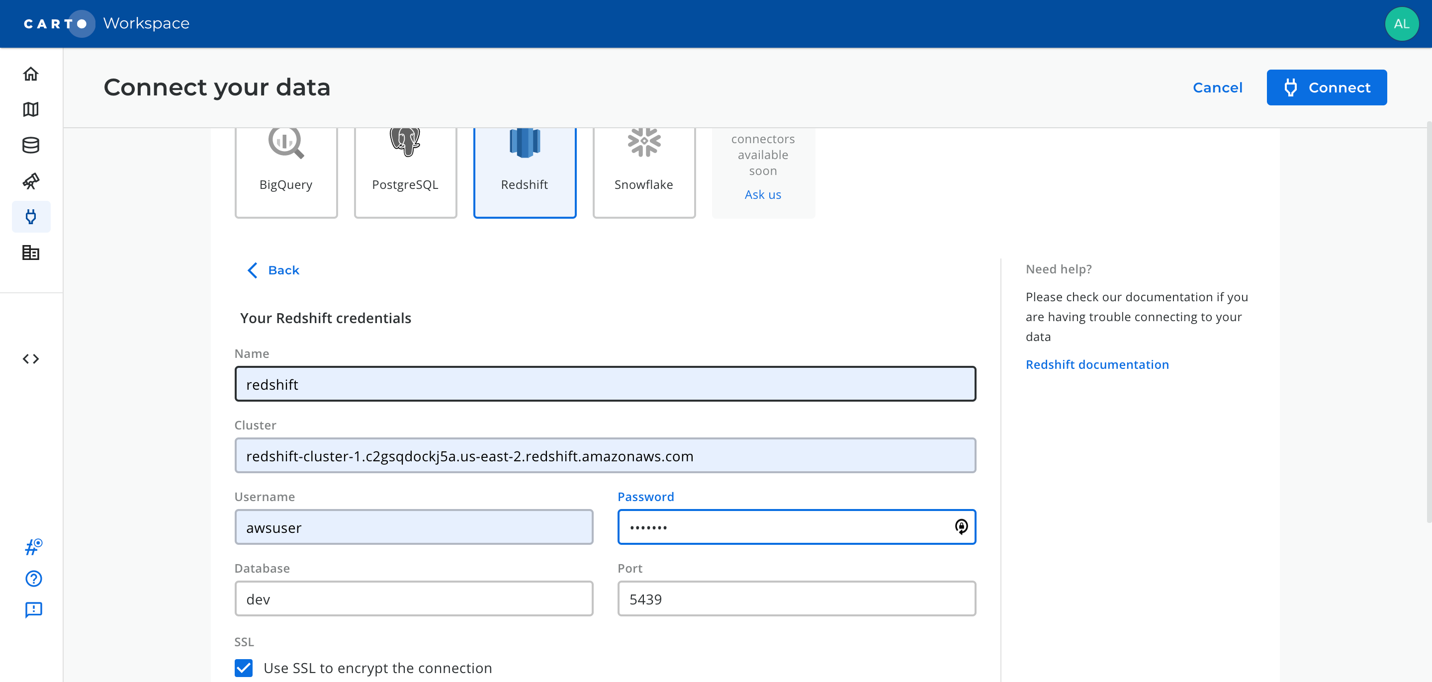 Once you have entered the parameters, you can click the Connect button. CARTO will try to connect to your Redshift cluster. If everything is OK, your new connection will be registered.