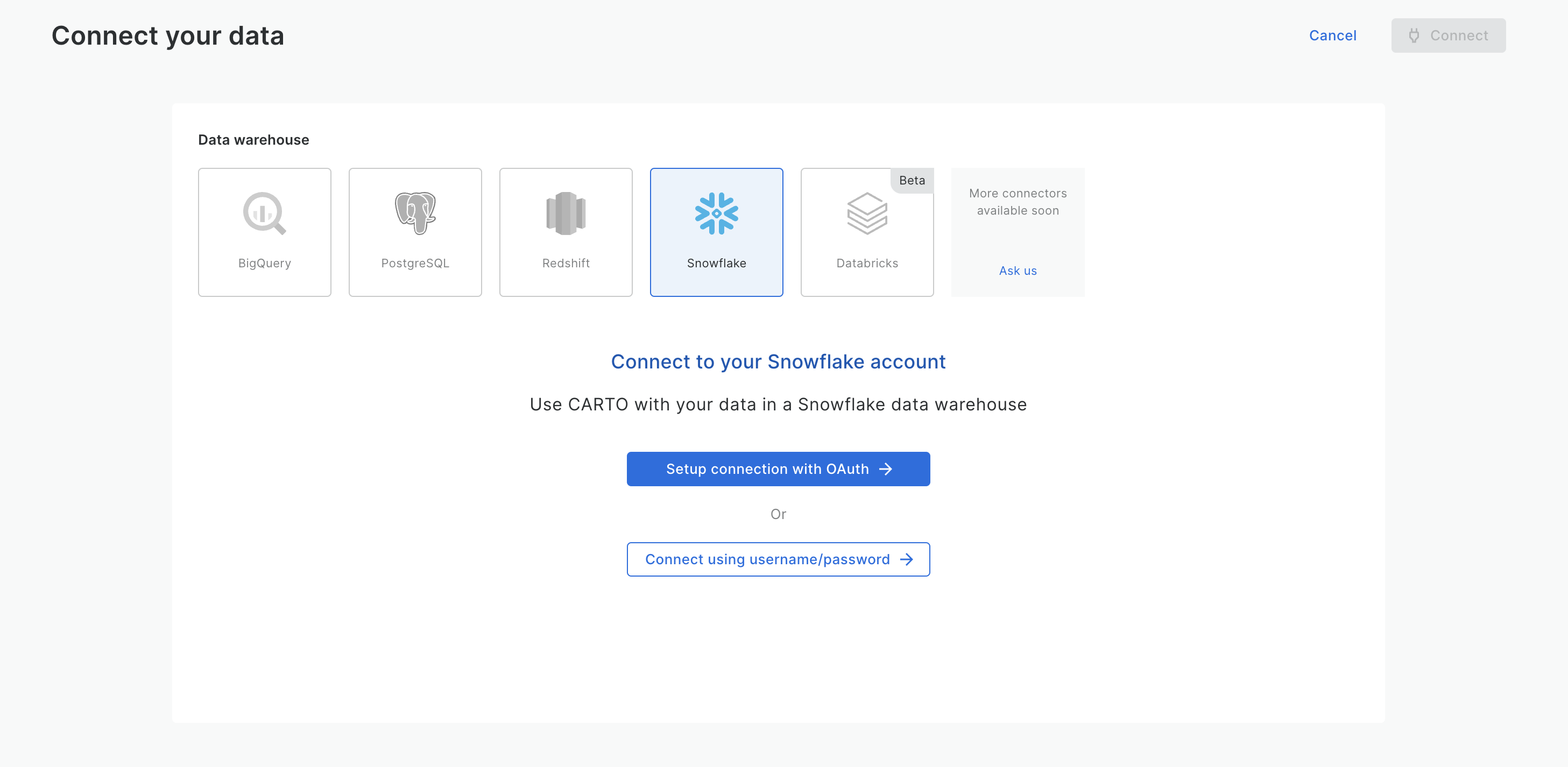 CARTO can connect to your Snowflake Data Warehouse, allowing you to use your data for building Maps and Workflows. There are three methods available for connecting to Snowflake: