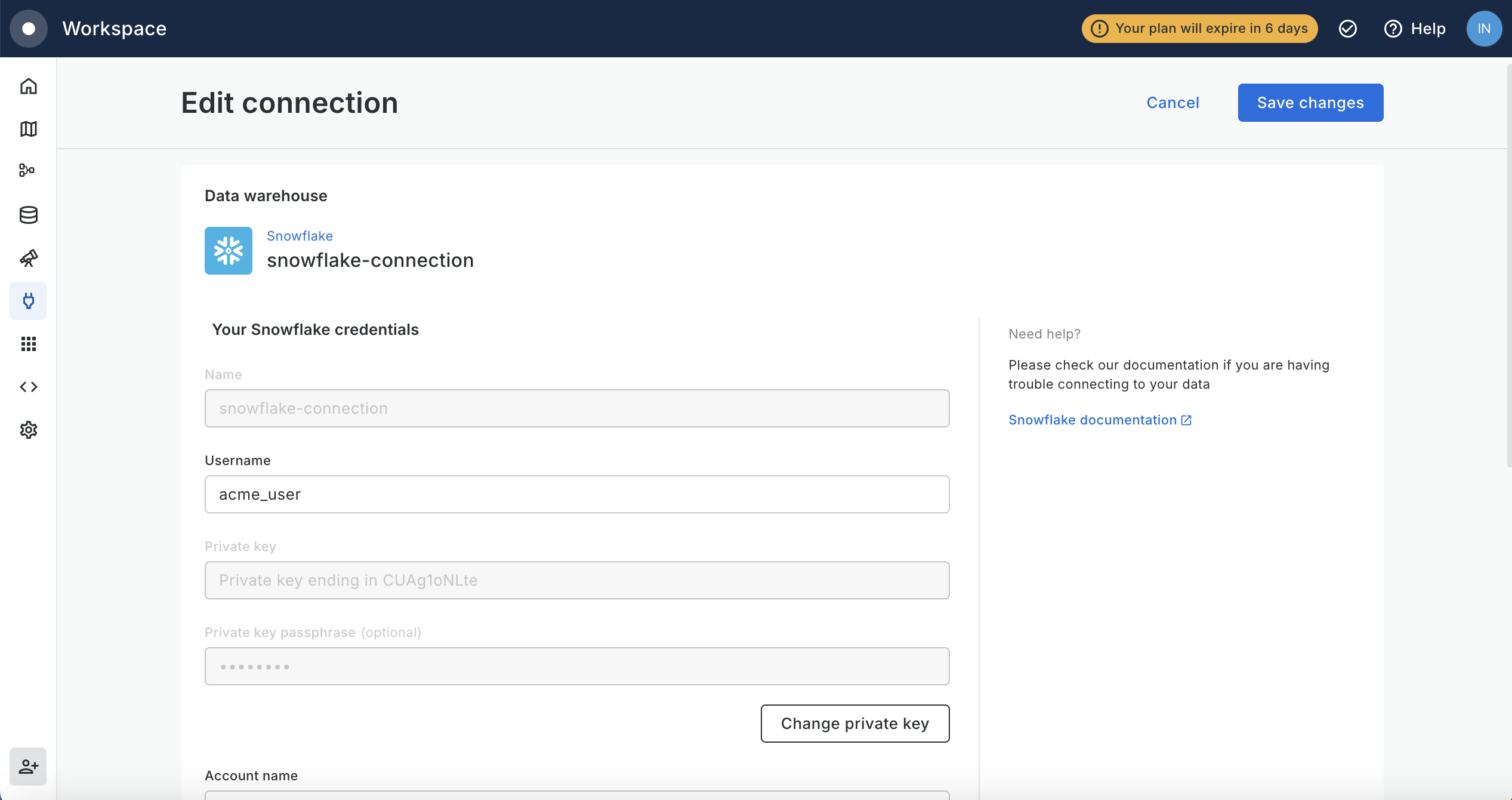 <figure><img src="https://3029946802-files.gitbook.io/~/files/v0/b/gitbook-x-prod.appspot.com/o/spaces%2FybPdpmLltPkzGFvz7m8A%2Fuploads%2Fgit-blob-b733dd92ae4c02ede69385aa03dcadc36ee41c9c%2FScreenshot%202025-01-21%20at%2014.56.45.png?alt=media" alt=""><figcaption><p>Connection settings of a Snowflake key-pair connection.</p></figcaption></figure>