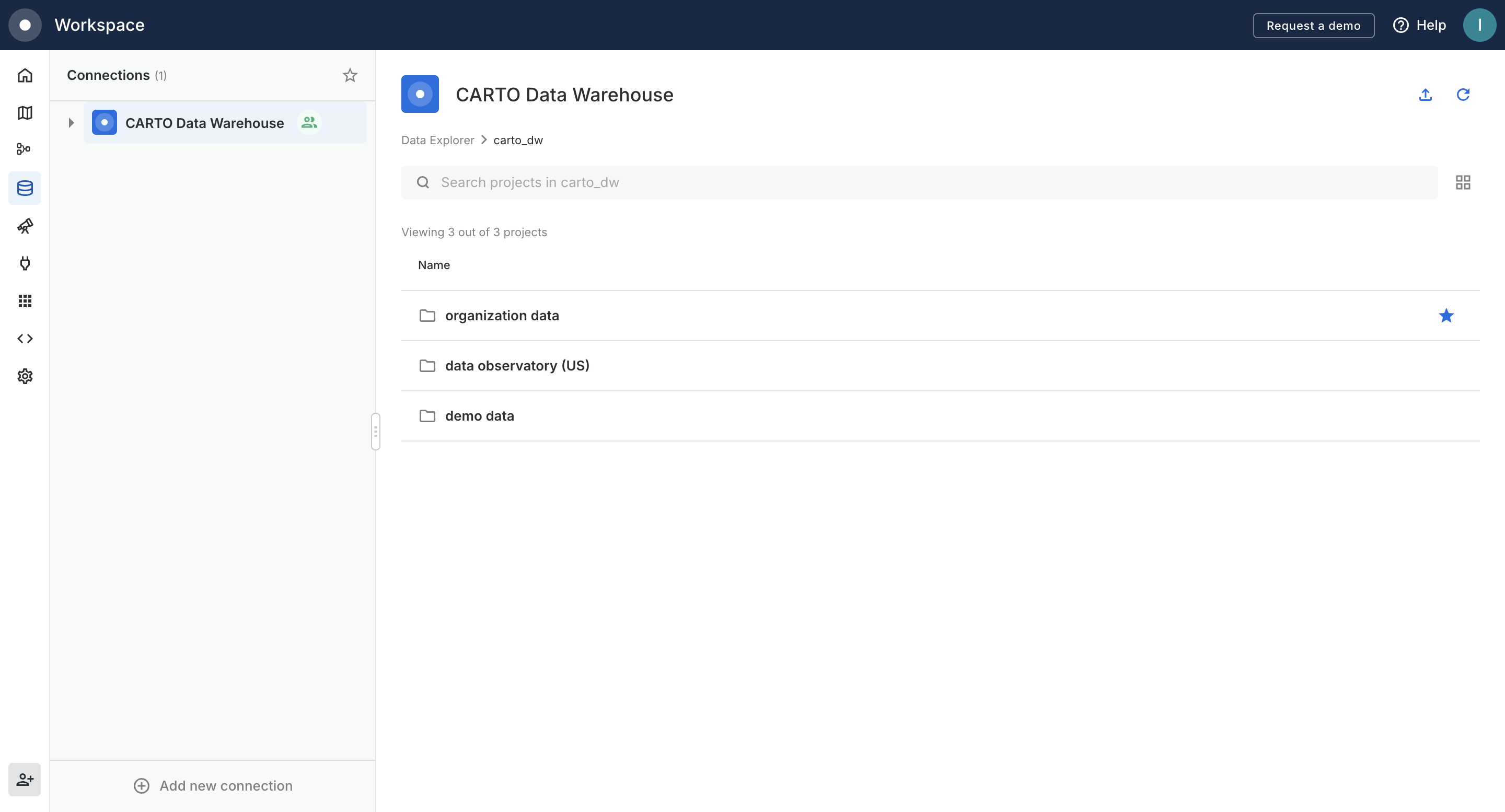 All CARTO organizations come with a default connection to the CARTO Data Warehouse, which you can use to browse pre-loaded example datasets and import your own data straight away. To create new connections to your own data warehouse(s), click the Add new connection button at the bottom of the left pane. Once connected, use the refresh button