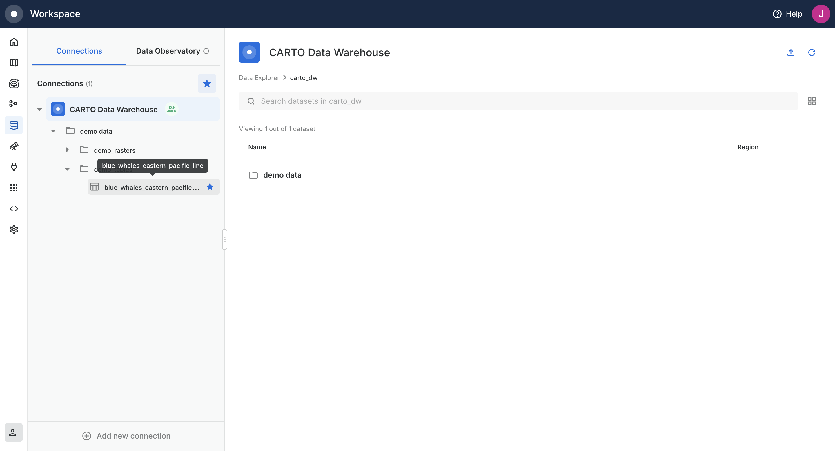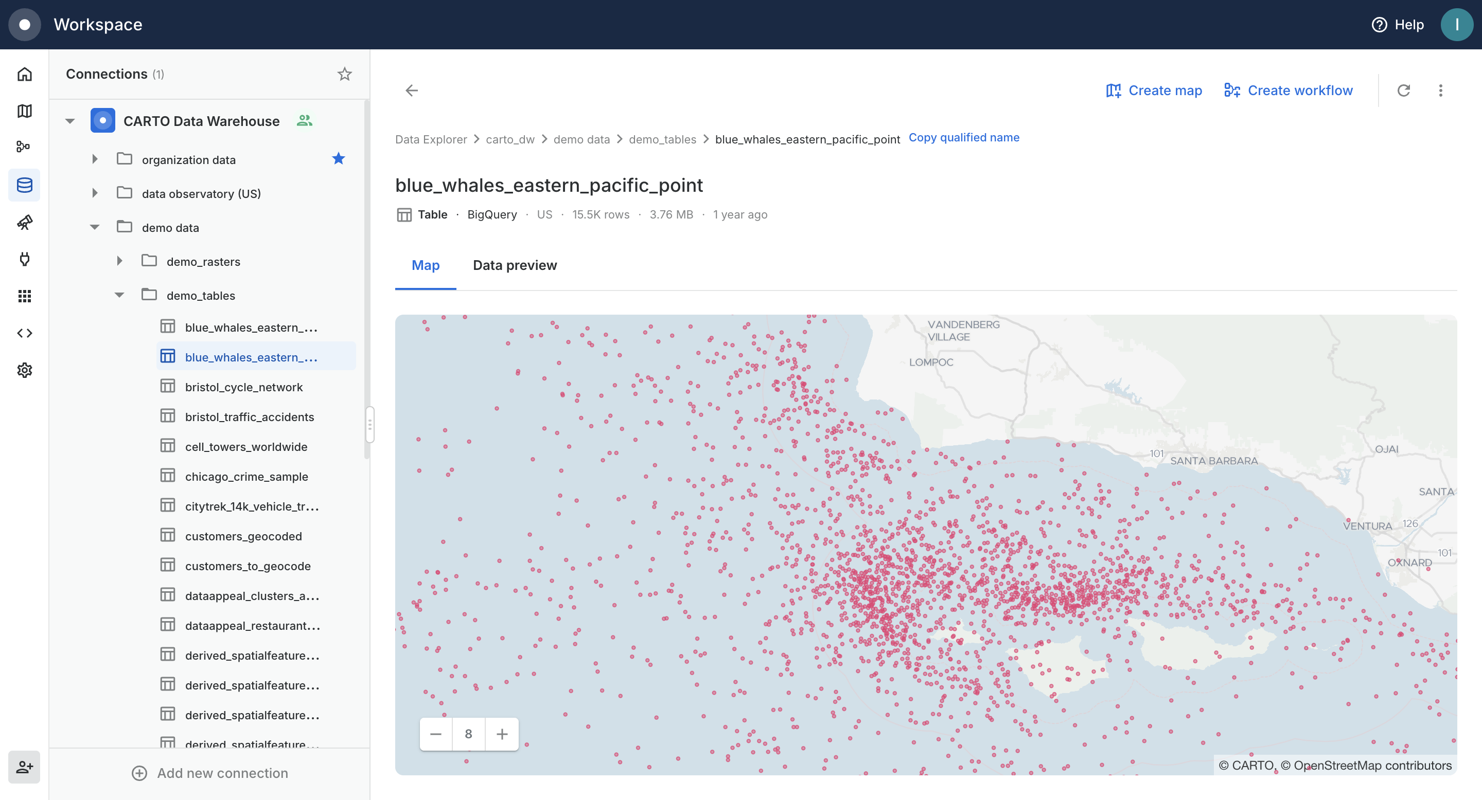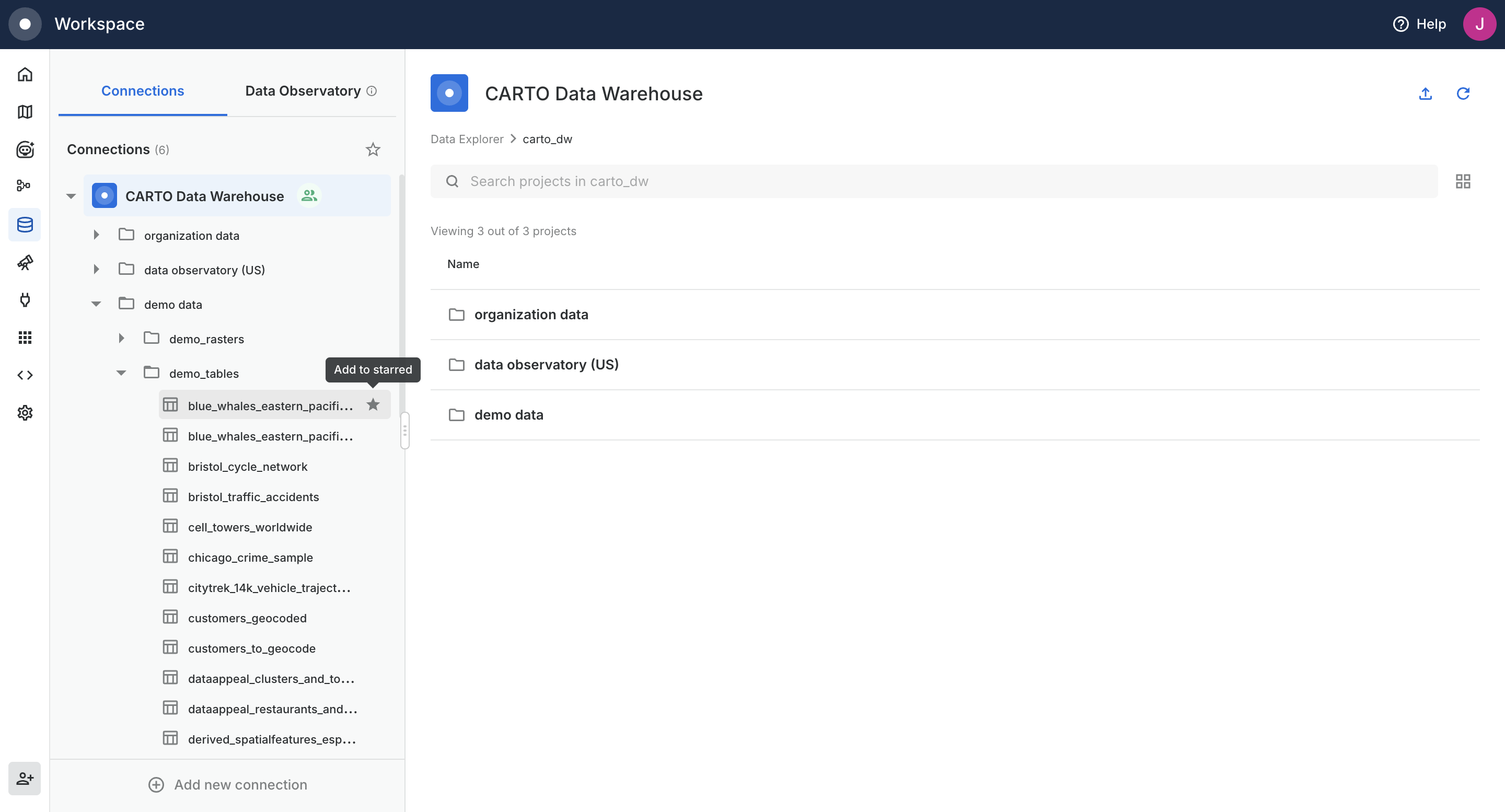The Data Explorer is your hub for browsing and working with data in CARTO. Use it to navigate your data warehouse connections, preview datasets, and create maps or workflows.