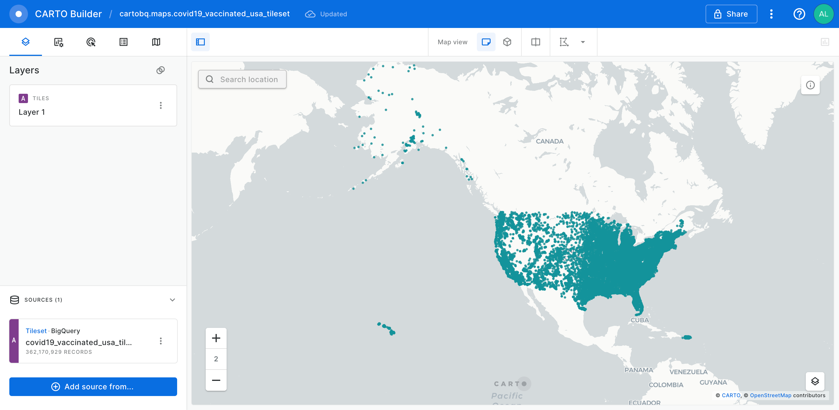 Once your table or tileset is selected, you can explore a preview of the map and the details of the specific table or tileset. You can create a map by clicking on the *Create map* button on the top. This will open the table/tileset as a layer on a CARTO Builder map.