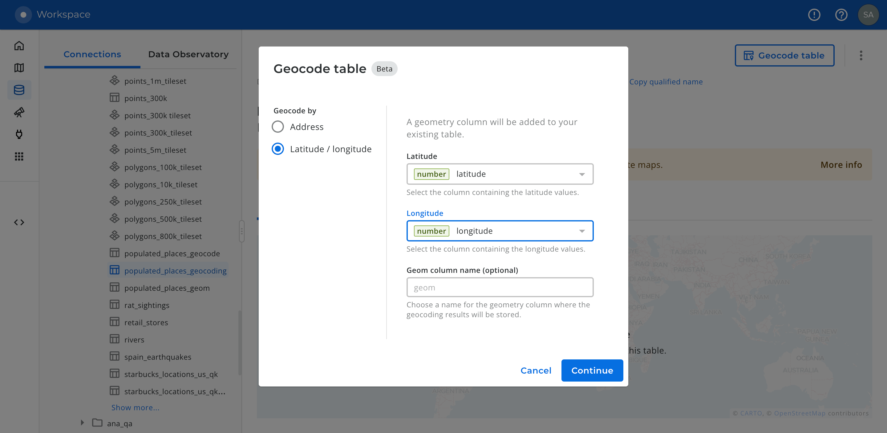If you are using BigQuery and you plan to repeat the geocoding process, bear in mind that if you drop columns from your table you won't be able to create columns with the same name for a period of time (7 days) because BigQuery reserves the deleted columns names for [*time travel*](https://cloud.google.com/bigquery/docs/time-travel) purposes. So, for example, instead of dropping the `geom` column to re-geocode all rows, update the table and set it to `NULL`.