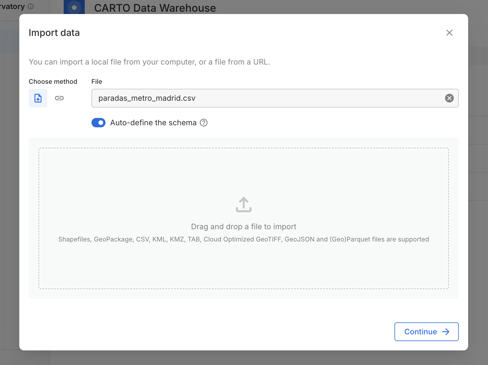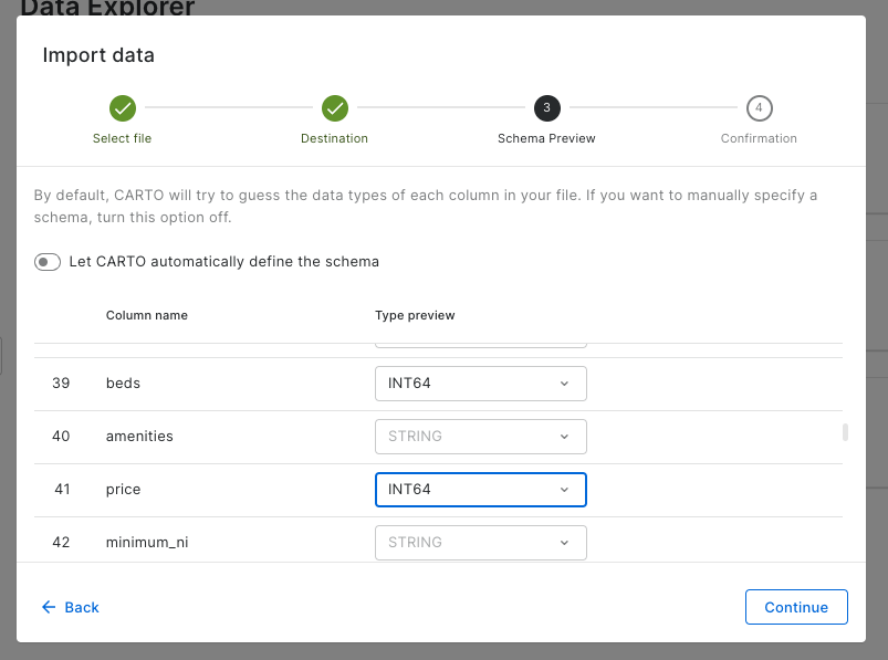 To define a custom schema, just make sure to disable the *Let CARTO automatically define the schema* switc&#x68;*.*