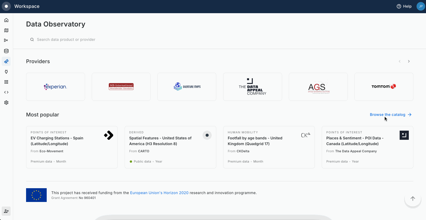 The Spatial Data Catalog is available from our [public website](http://www.carto.com/data) and also from within the CARTO Workspace once you [log into](http://www.carto.com/login) your account and navigate to the *Data Observatory* section.