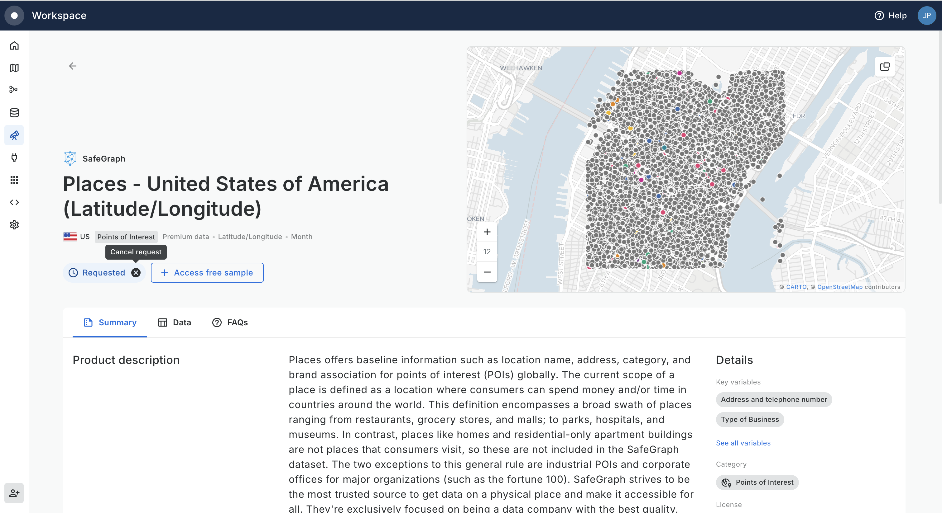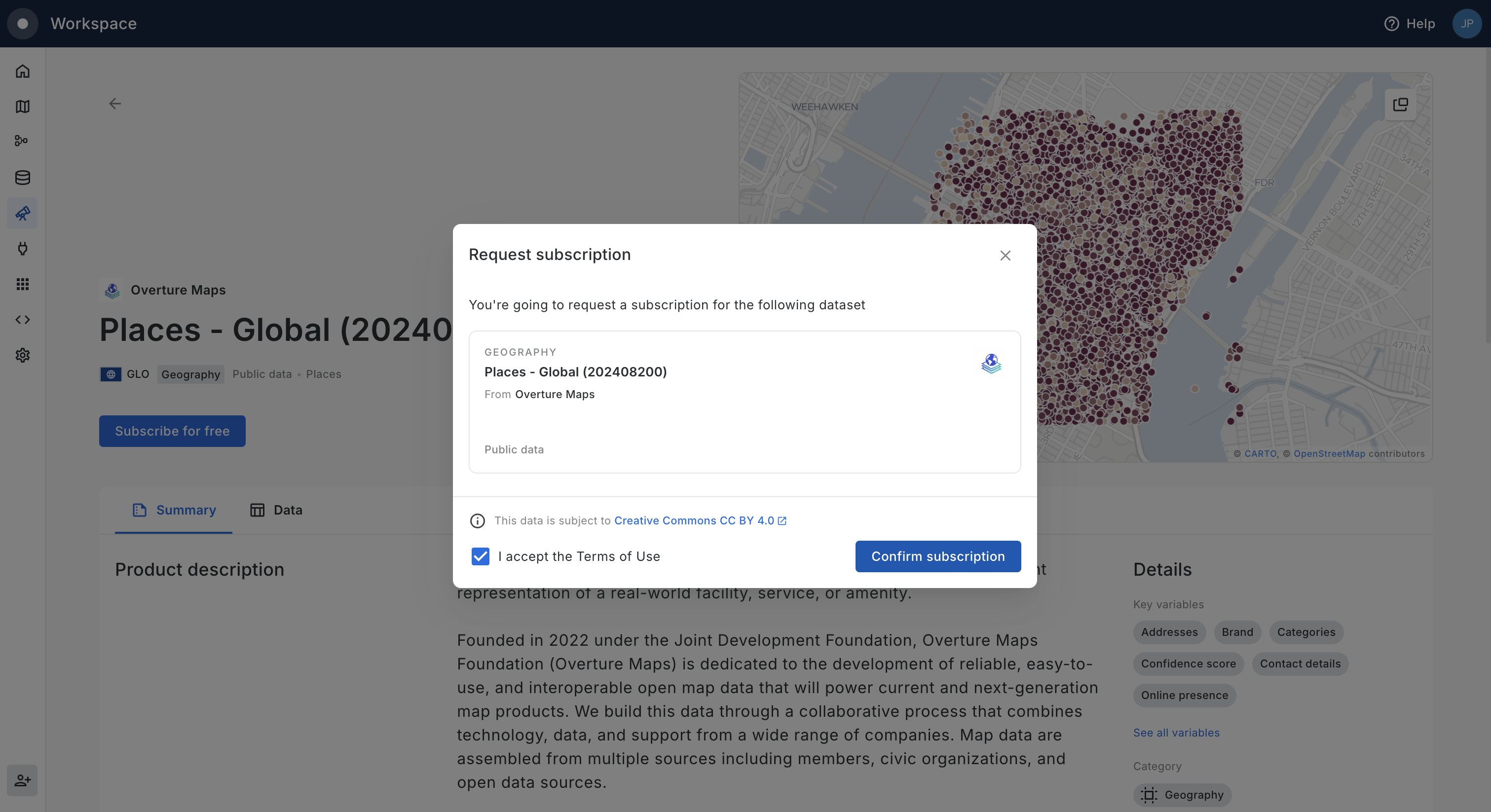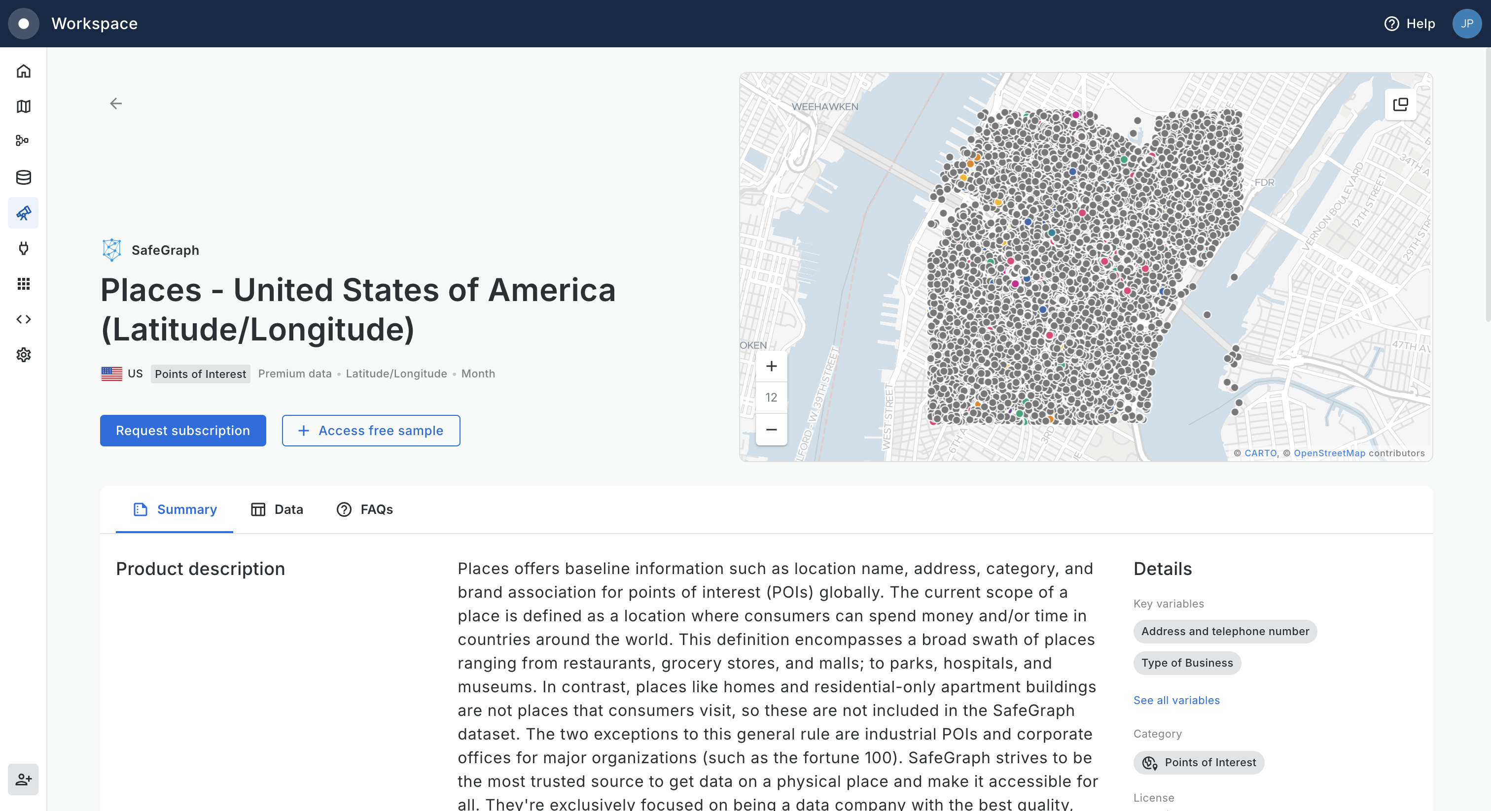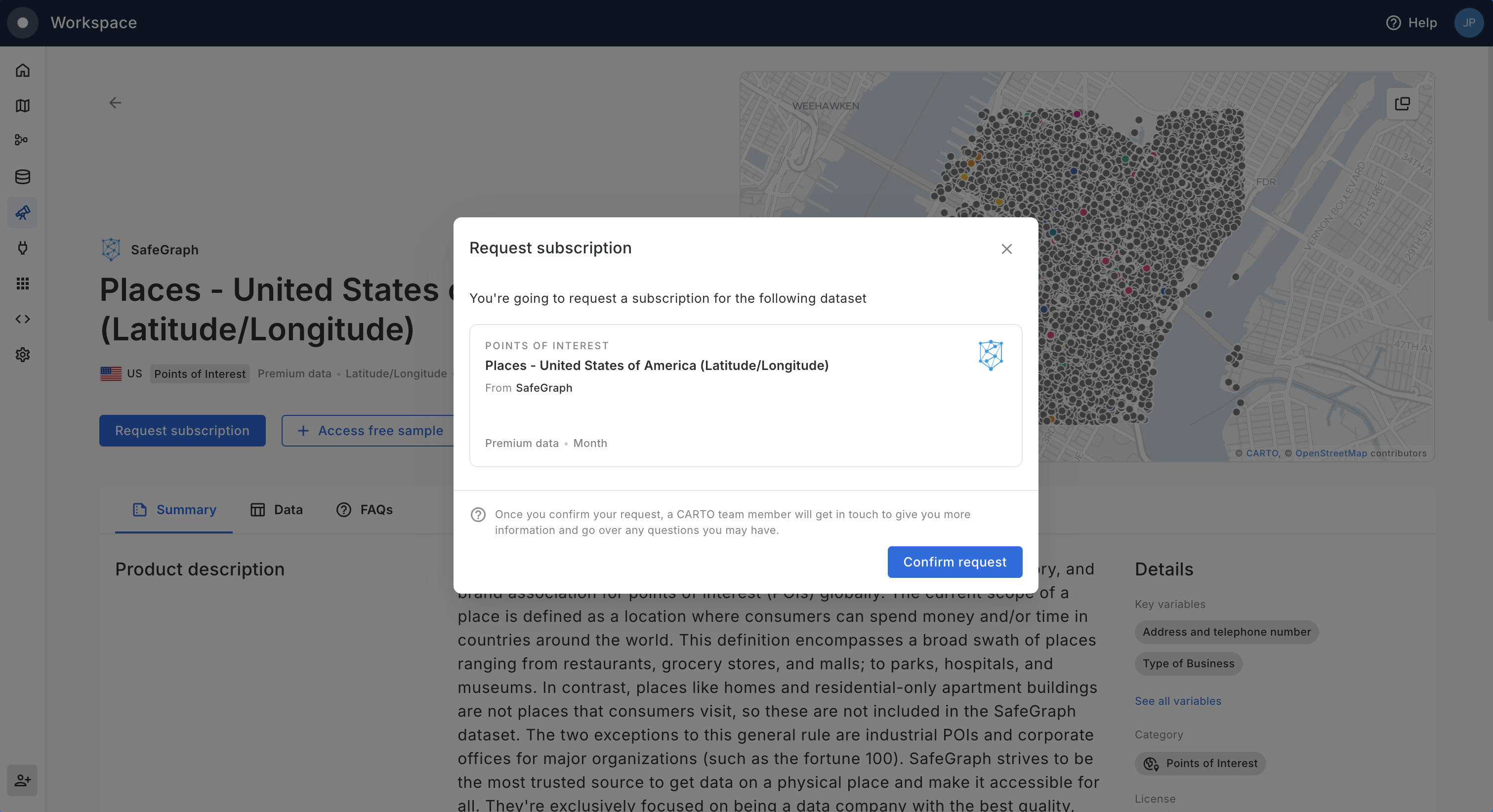 Using the same Data Observatory interface within the CARTO Workspace users can instantly subscribe to any of our public datasets and submit requests to start the licensing process of premium datasets from our vetted data sources.