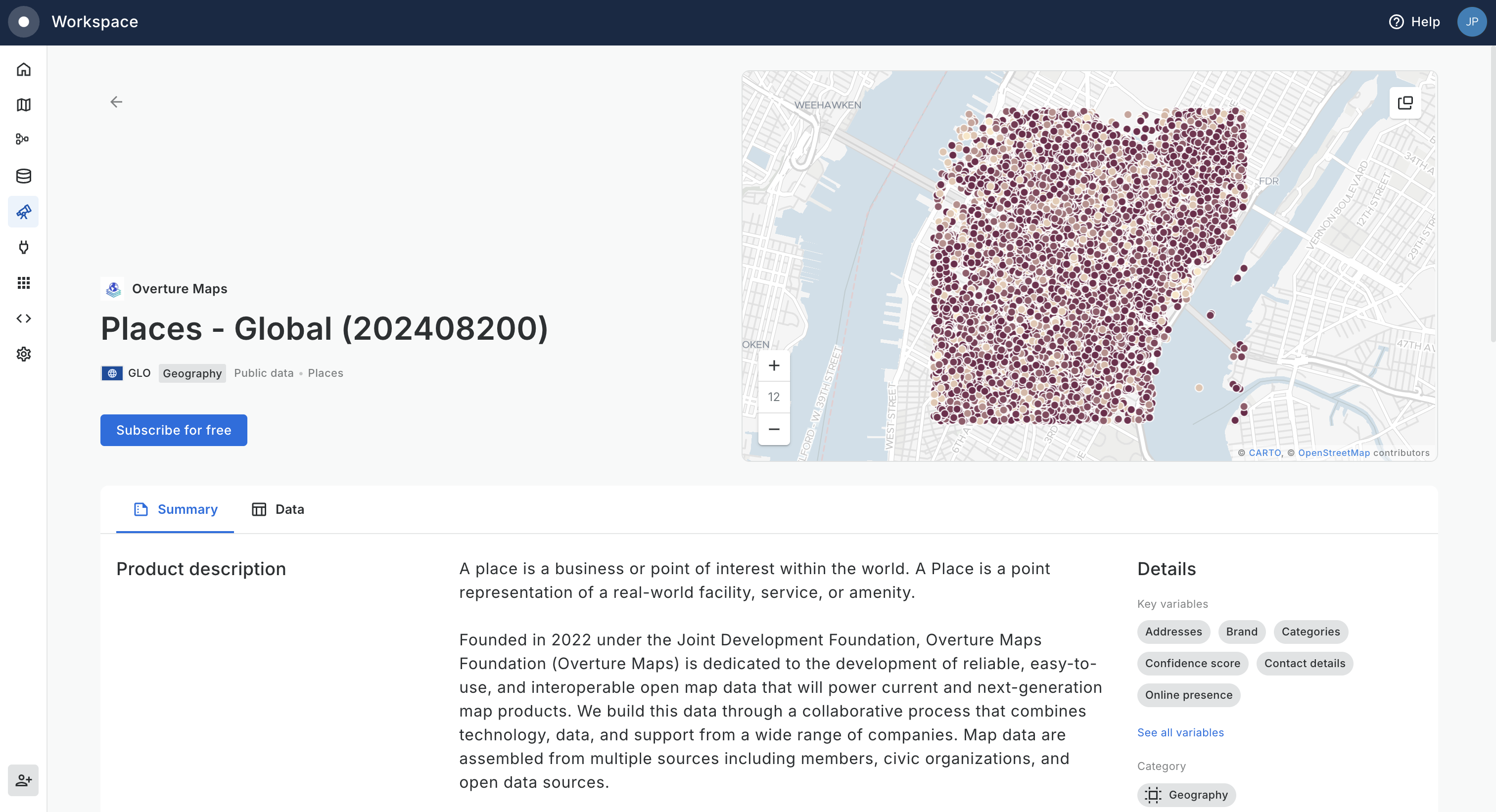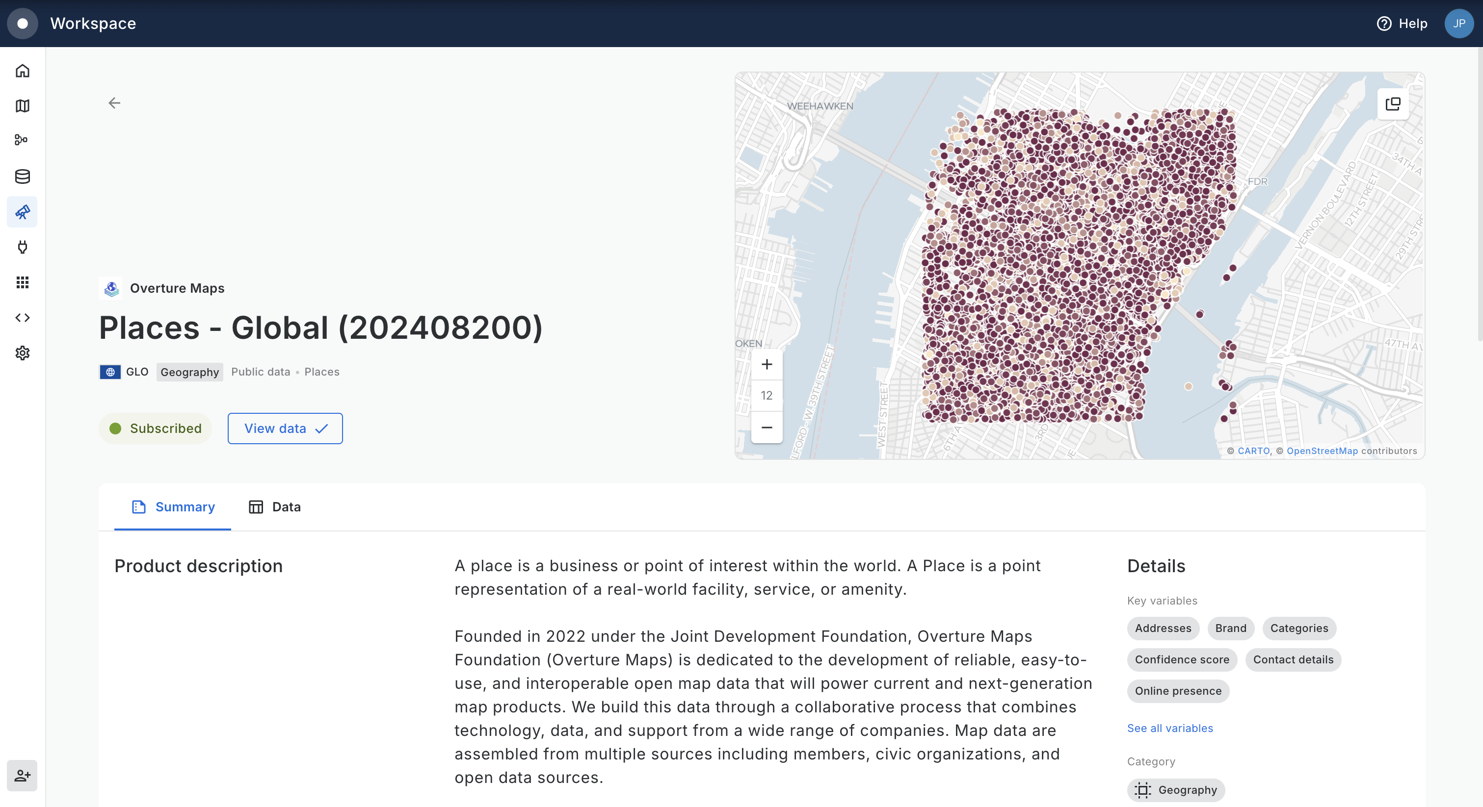 Once the subscription is confirmed, you will be able to click on *View data* to access the dataset (using the CARTO Data Warehouse resources).