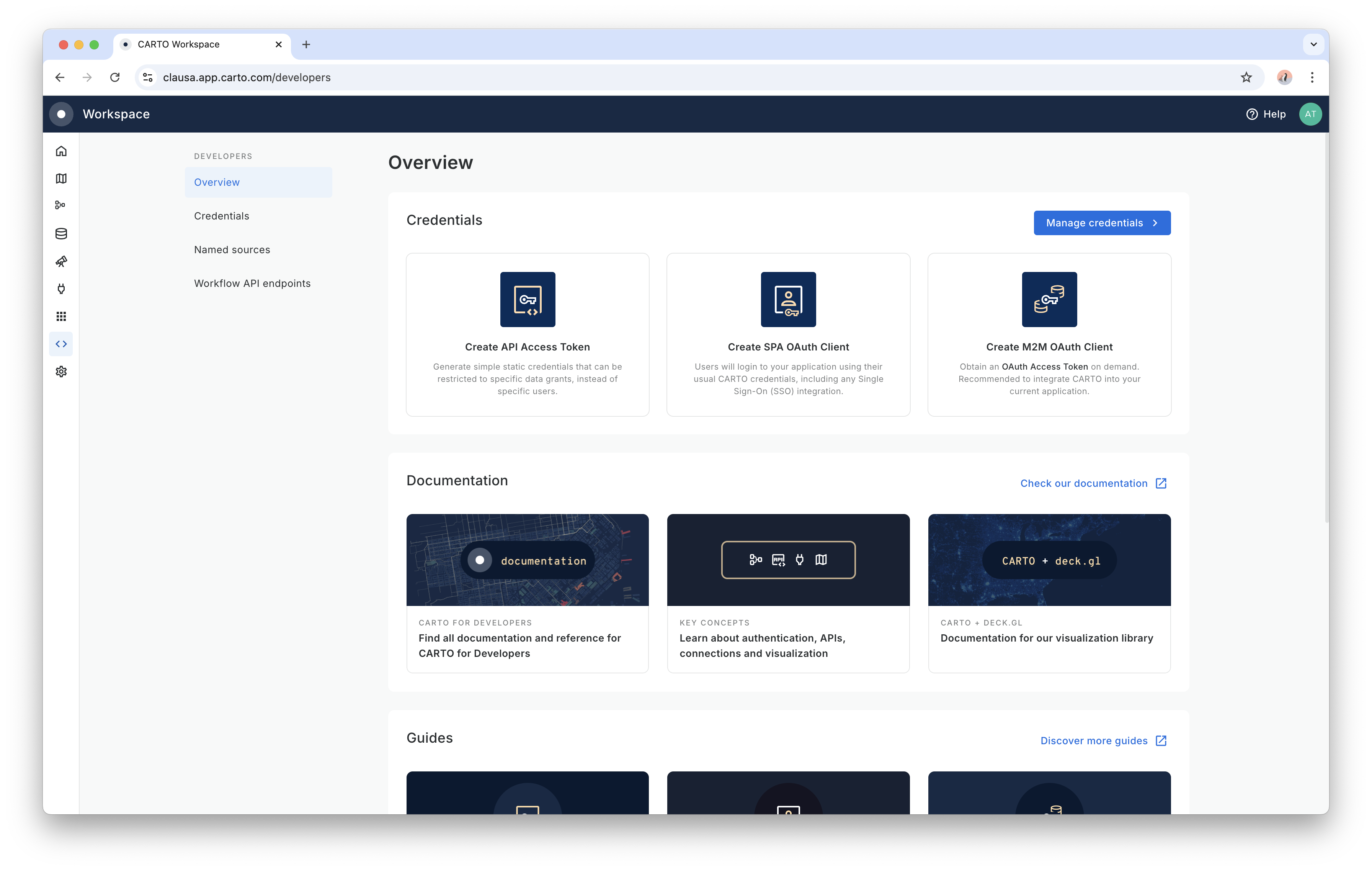 * **Credentials management:** Manage the authentication credentials for your different projects, from simple and static API Access Tokens to more dynamic OAuth Clients. [Learn more about Credentials](https://docs.carto.com/carto-user-manual/developers/managing-credentials).