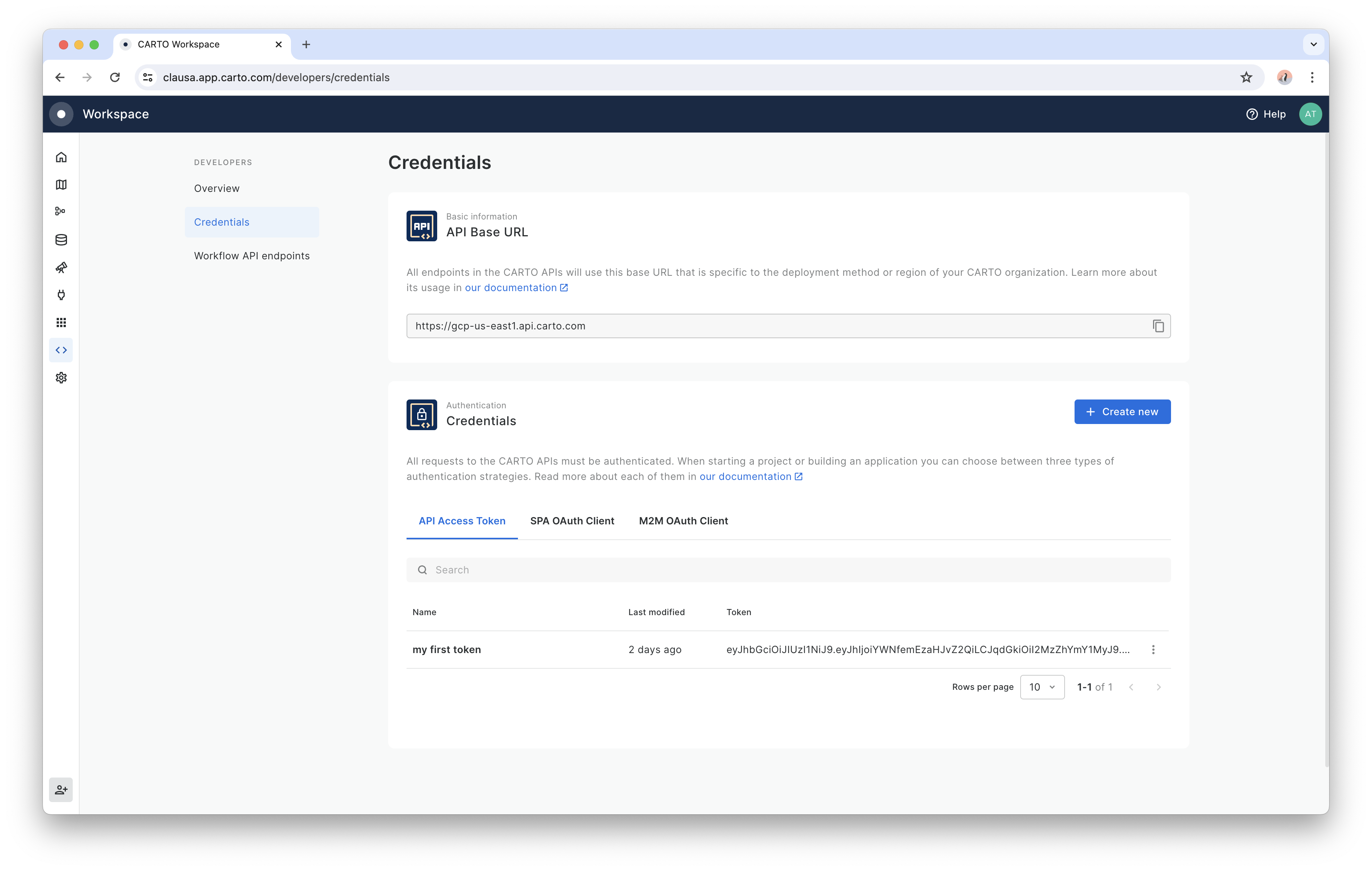 This section allows you to seamlessly create, edit and manage [API Access Tokens](https://docs.carto.com/carto-user-manual/developers/managing-credentials/api-access-tokens), [SPA OAuth Clients](https://docs.carto.com/carto-user-manual/developers/managing-credentials/spa-oauth-clients), and [M2M OAuth Clients](https://docs.carto.com/carto-user-manual/developers/managing-credentials/m2m-oauth-clients). It also contains the current **API Base URL** that you should use in all your API calls. [Learn more about the API Base URL](https://docs.carto.com/carto-user-manual/developers/managing-credentials/api-base-url).