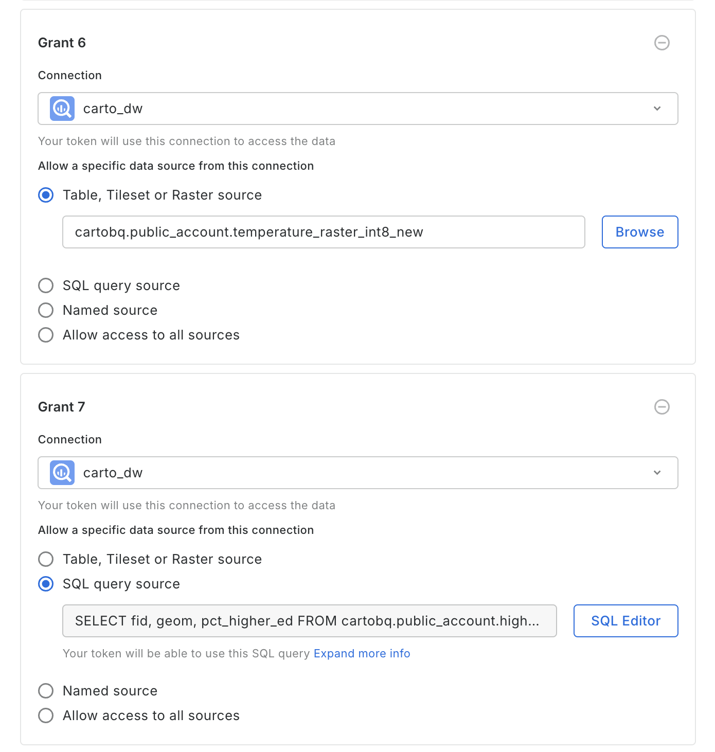 * **Named Source:** Select or type a specific [Named Source](https://docs.carto.com/carto-user-manual/developers/named-sources) that this token should have access to. It's equivalent to a SQL query source.
