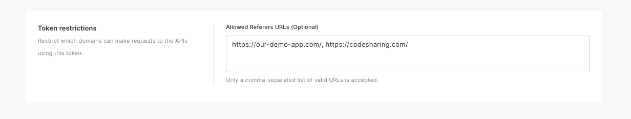 To do so, just specify a list of **Allowed Referers URLs**, separated by commas. All requests using this token from these URLs will be considered valid, while all the other requests will be rejected.