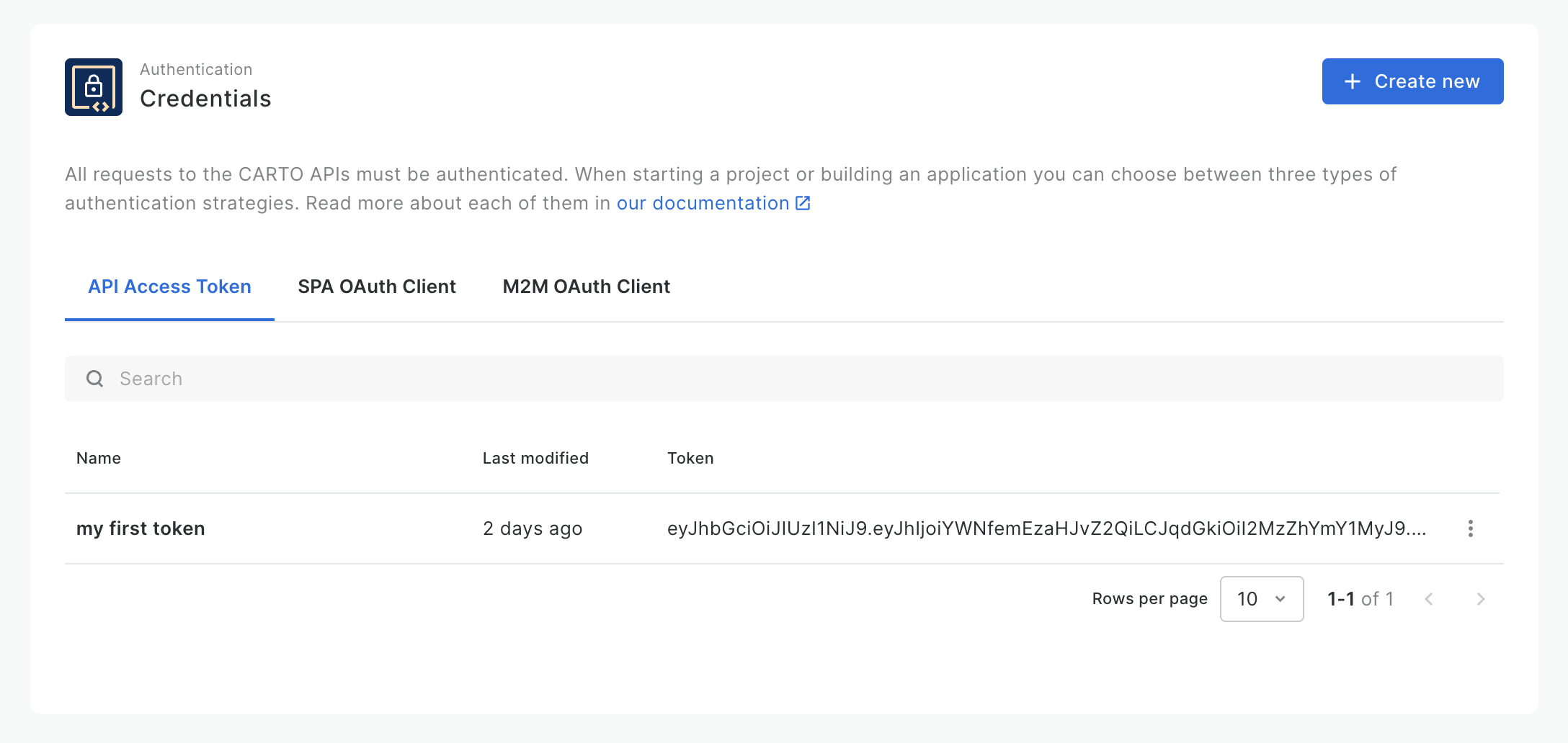 To use your token, simply go back to the list of available tokens, hover your mouse over the token and click on **"Copy Token"**. Your token will be copied to your clipboard and you can just use it in your API calls, as described in our [API documentation](https://api-docs.carto.com).