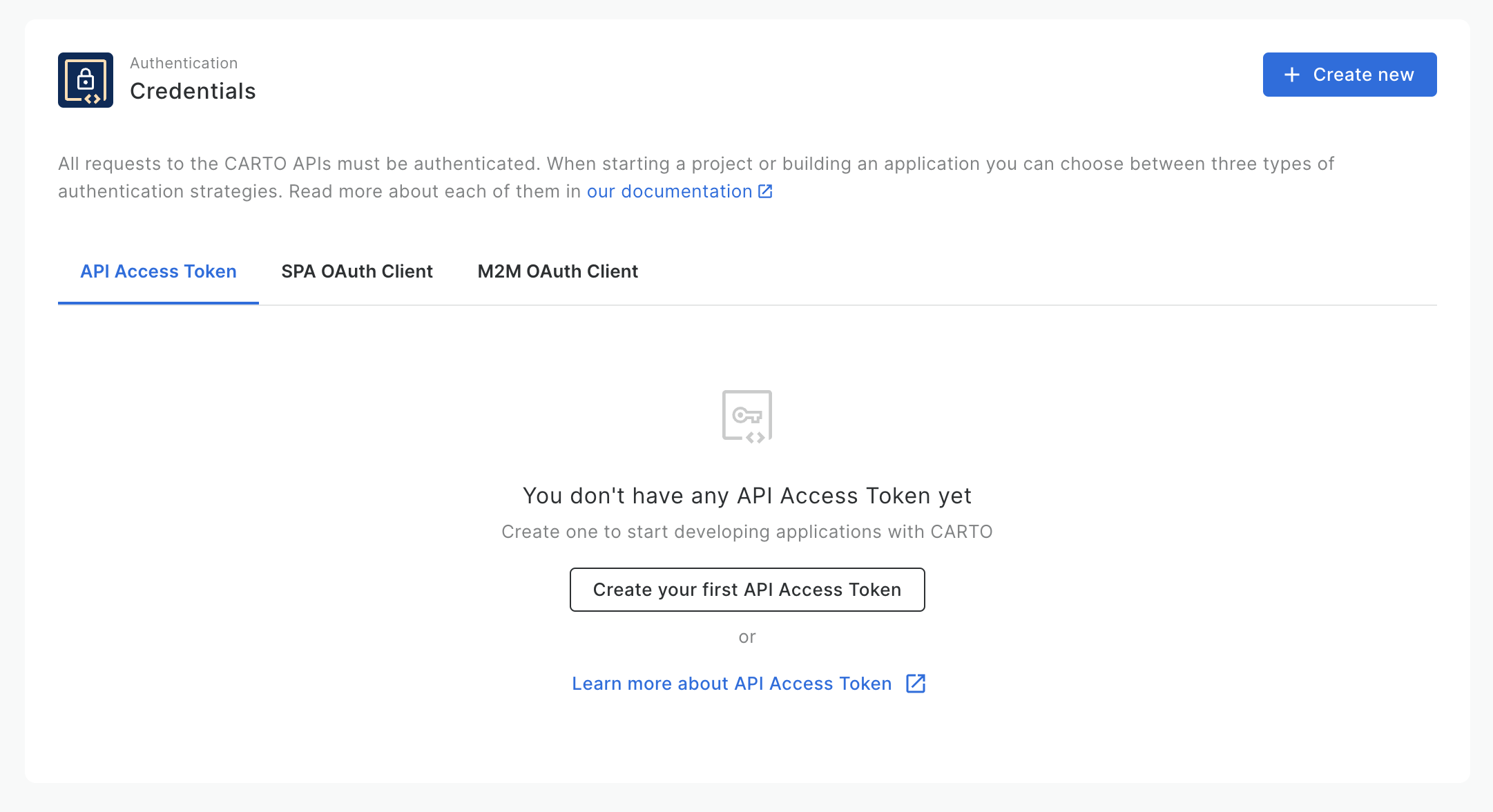All developer credentials can be created, edited, and managed in the Developers > Credentials section in CARTO Workspace. One of the most common developer credential types in CARTO are **API Access Tokens,** which are managed in this tab.