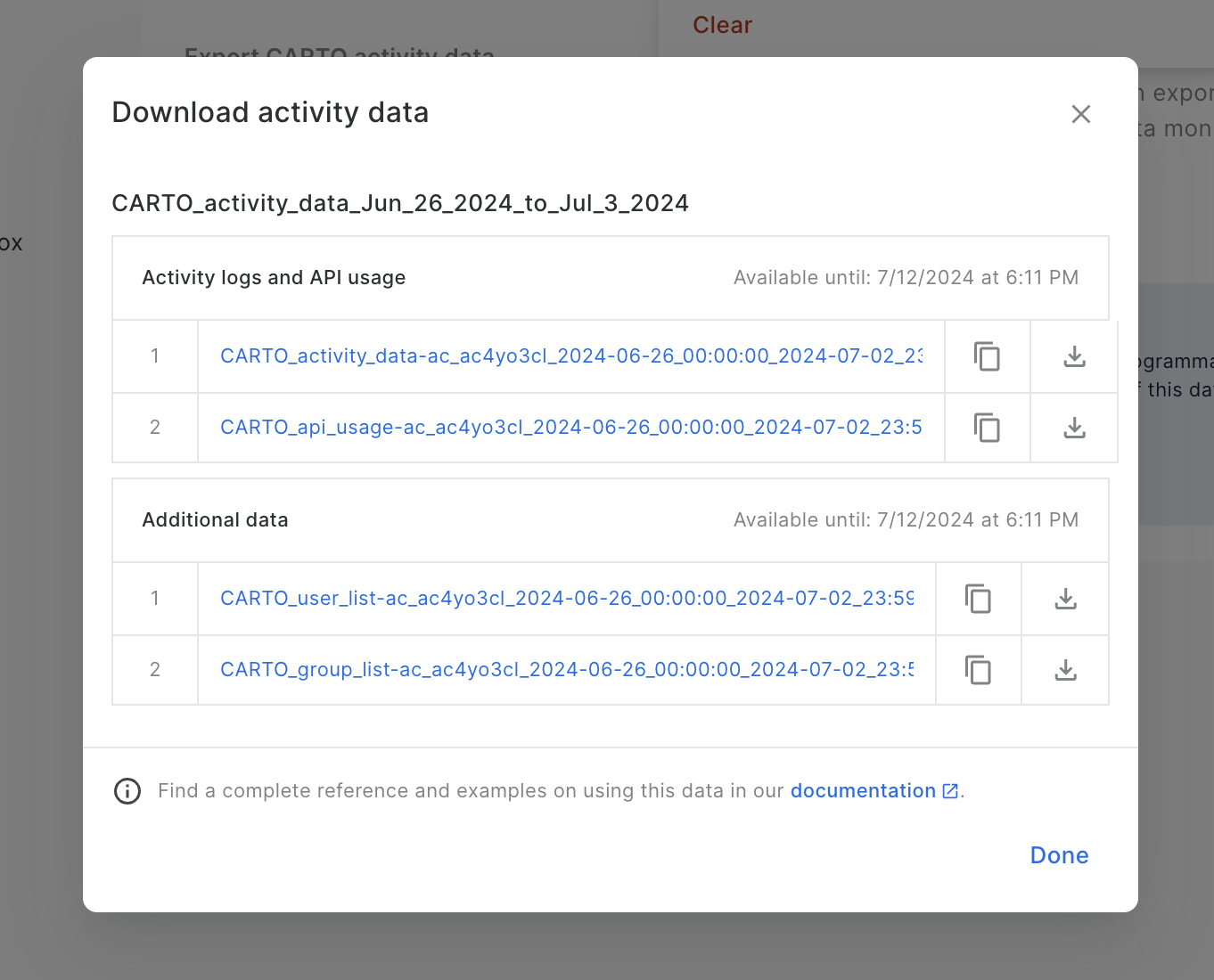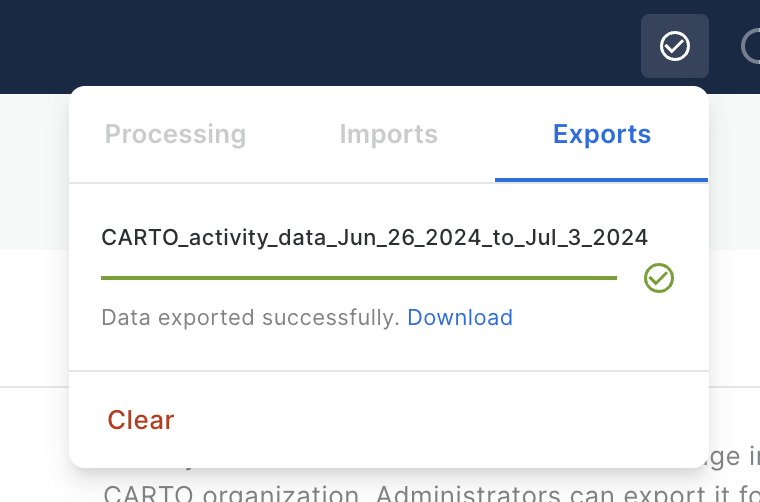 Administrators in CARTO can analyze very granularly what is happening inside their organization with our detailed **Activity Data.** This data can be exported manually using the UI, or obtained programmatically via API.