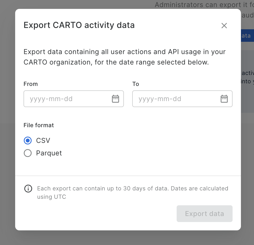 You will need to select the **period of data** that you want to export. Data is available since the beginning of your CARTO organization, but each operation can only export a **maximum of 60 days of data**. If you want to schedule or automate this export, please check [Access via API](#access-via-api).