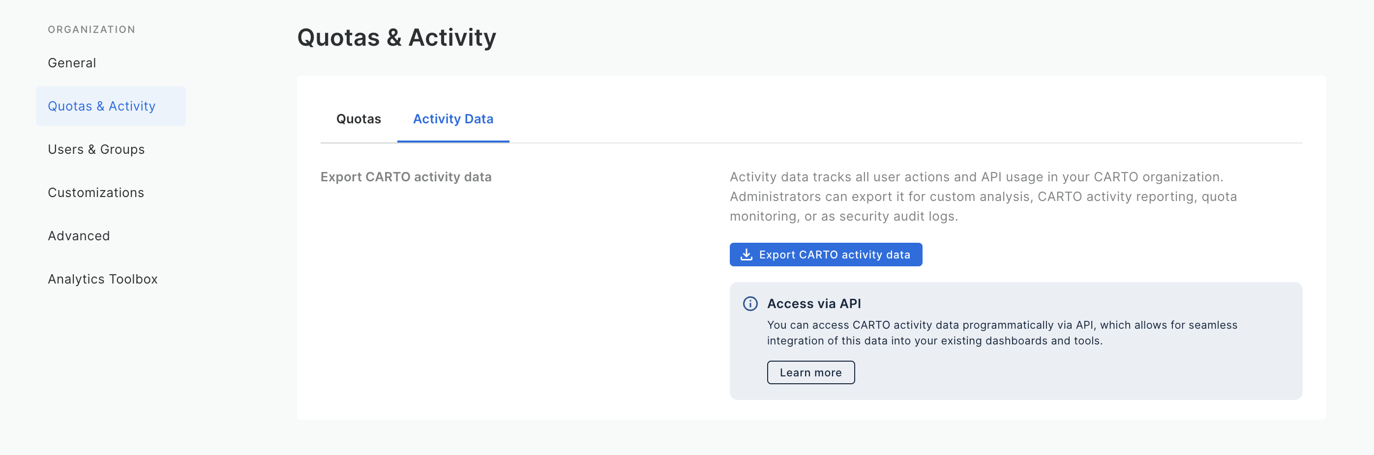 Activity Data is only available for Enterprise Medium plans and above. Please get in touch at <support@carto.com> if you’re interested in this feature.
