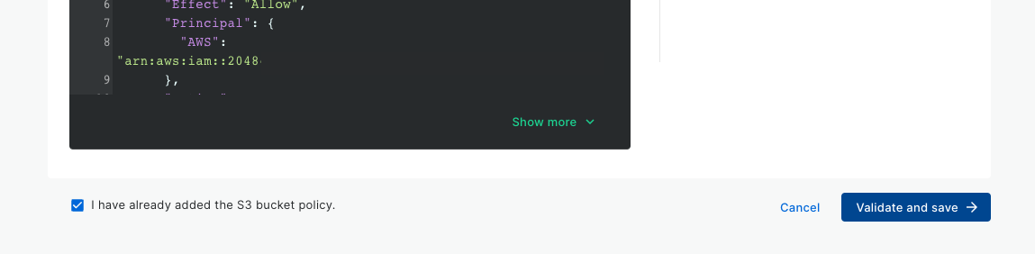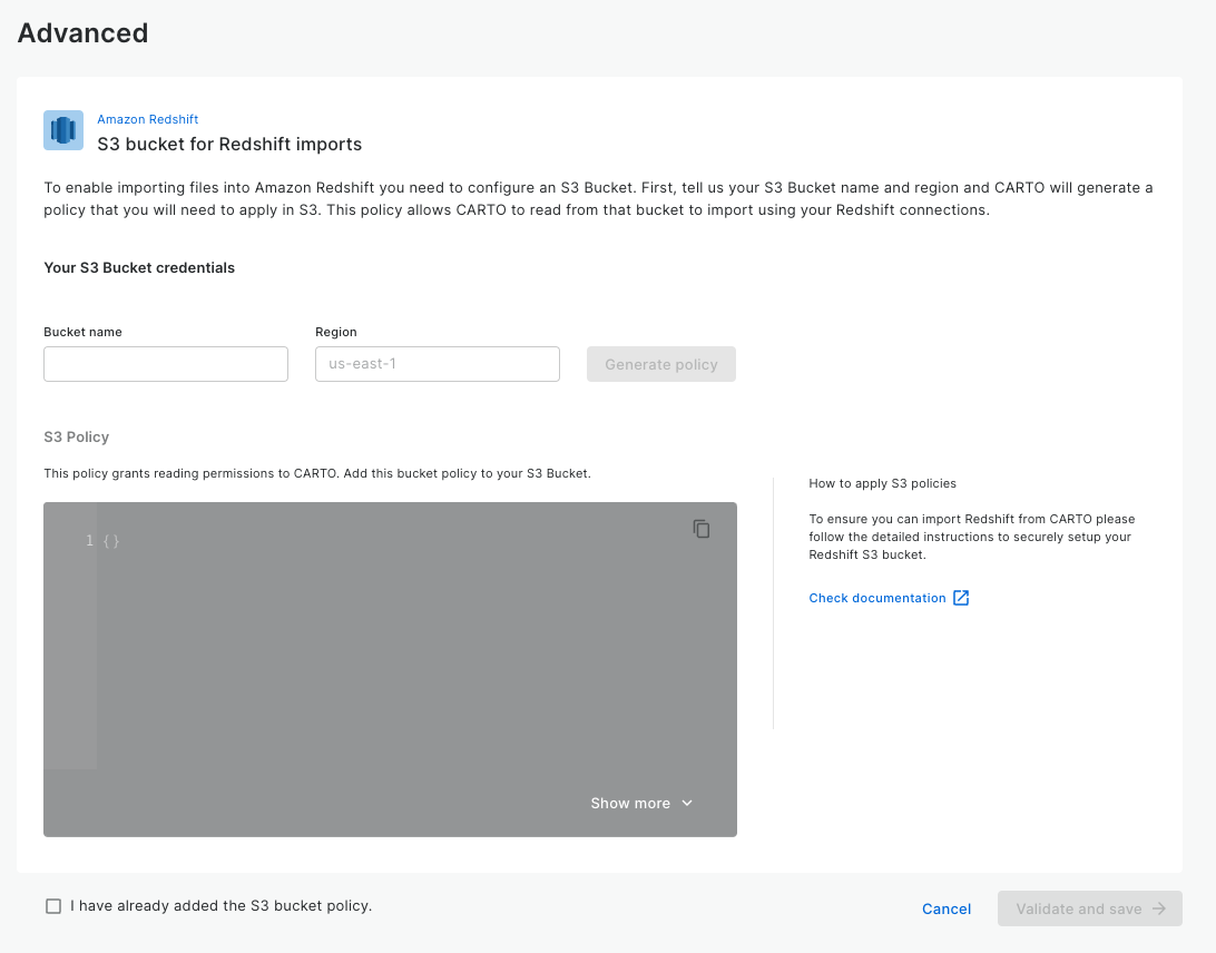 Once you've finished the configuration in AWS, go back to CARTO. Mark the *"I have already added the S3 bucket policy"* checkbox as done and click on "**Validate and Save**"