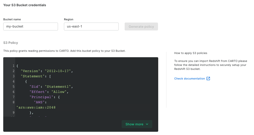 1. Copy and **paste the policy** generated by CARTO into the policies of your S3 Bucket in AWS.