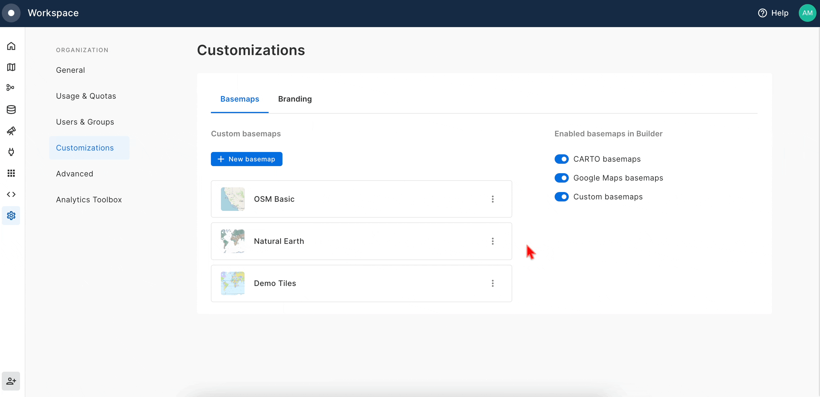 In this section, you have the flexibility to manage the types of basemaps available in Builder, including default CARTO basemaps, Google Maps basemaps, and custom basemaps. You also have the option to upload your own custom basemaps in supported formats, ensuring your maps precisely meet your organizational specifications. Discover more about basemap configurations here.