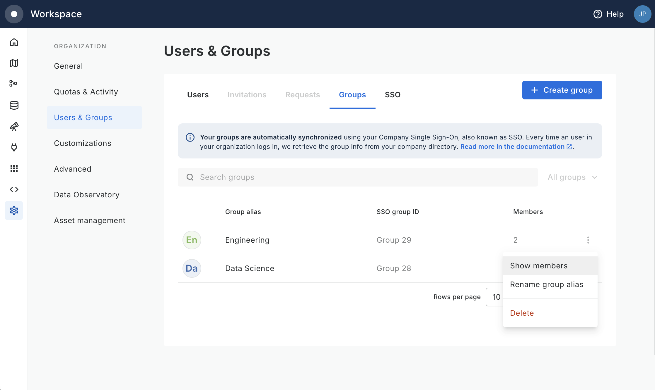 Organizations using [Single Sign-On (SSO)](https://docs.carto.com/carto-user-manual/settings/sso) can leverage user groups from their Identity Provider (IdP) to facilitate sharing assets (e.g., sharing a map with an entire group) and to [automatically assign user roles](https://docs.carto.com/carto-user-manual/settings/users-and-groups/mapping-groups-to-user-roles).