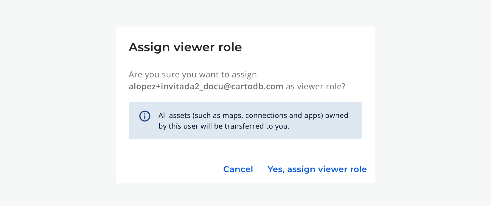 If you downgrade an Editor or Admin to Viewer, you will have to select which user will inherit their assets (such as Maps, Workflows, Connections, CARTO Data Warehouse private files, apps, etc). Viewers can't own any assets in CARTO.