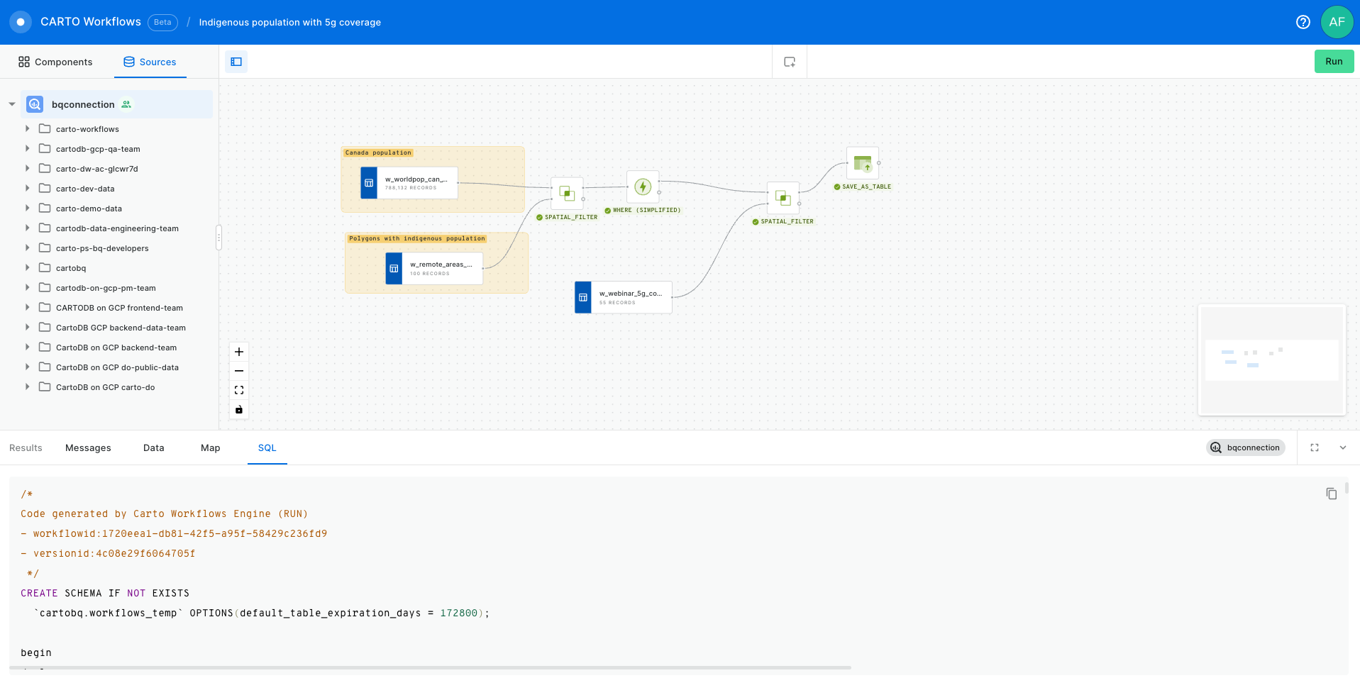 Once you have designed a workflow, you might want it to be executed periodically. This allows to have the result of a workflow automatically updated if the input data sources of a workflow have been modified between the last execution and the next one. For this purpose, CARTO offers a UI that helps creating a scheduled query in different Data Warehouses.