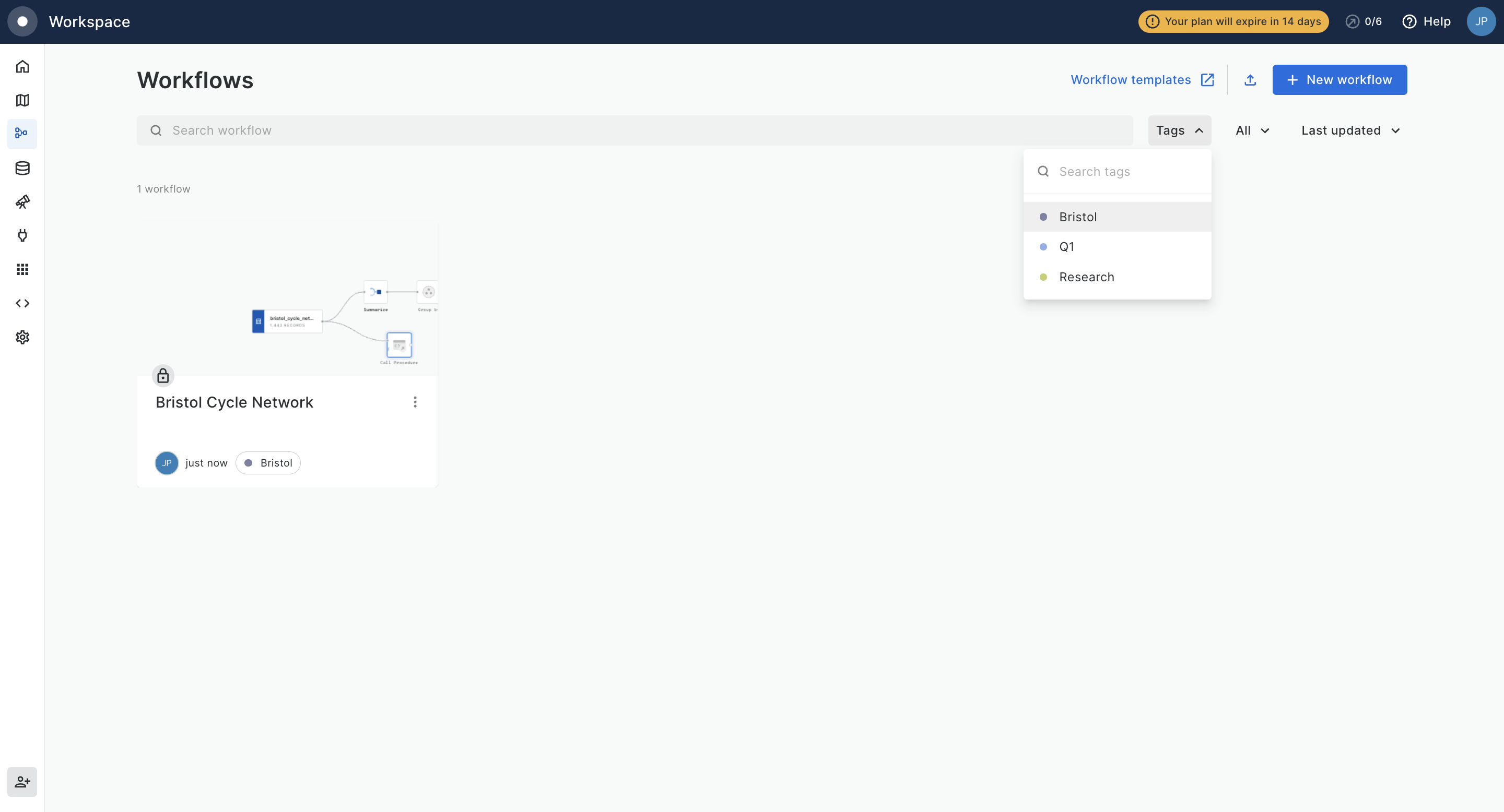 Additionally, you will be able to filter workflows by tags using the tag filter in the workspace. Once a tag filter is applied, you will be able to copy the URL and share it with other users within your organization.