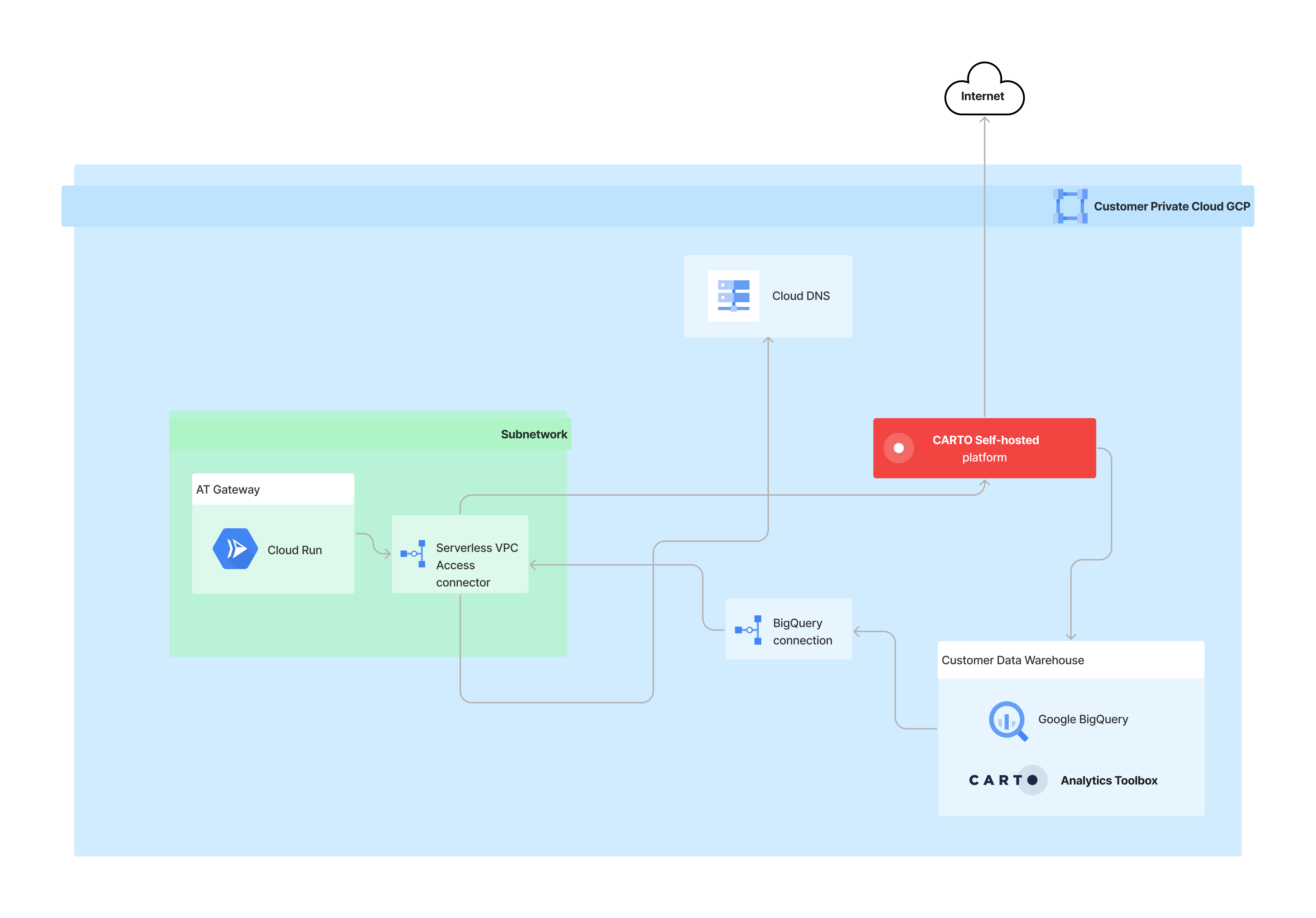 AT Gateway: Creation of isolines, geocoding and routing require making calls to CARTO LDS API. Some functions of the Analytics Toolbox require making a request to the CARTO Platform backend (like importing from a URL or the 'Send by Email' component in Workflows) . For this purpose, Cloud Run functions need to be deployed in your VPC.