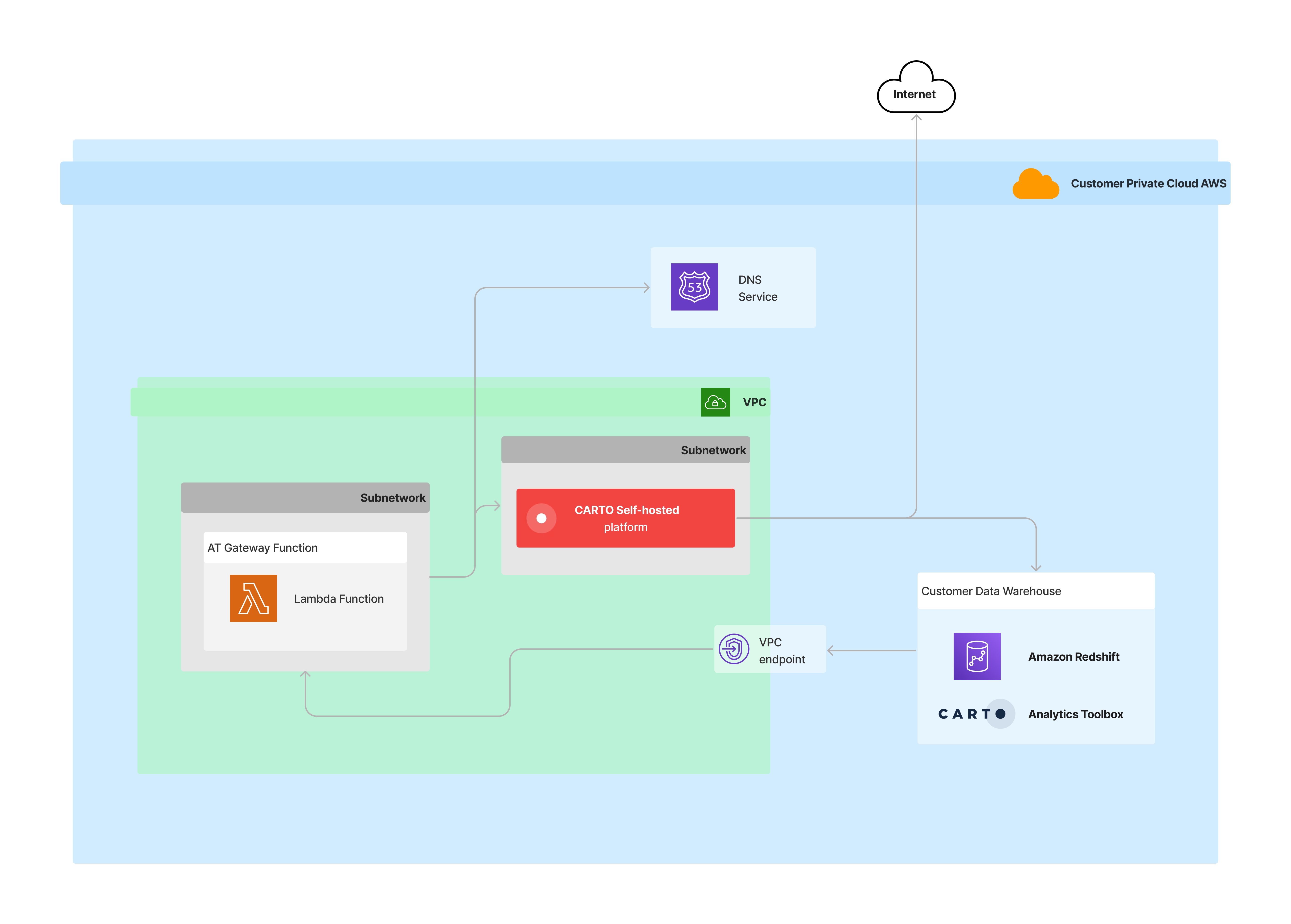 The Lambda functions need to access the CARTO Self-hosted LDS API. Since requests are handled inside the VPC, you need an internal DNS entry for the Lambda functions to reach the CARTO platform APIs.