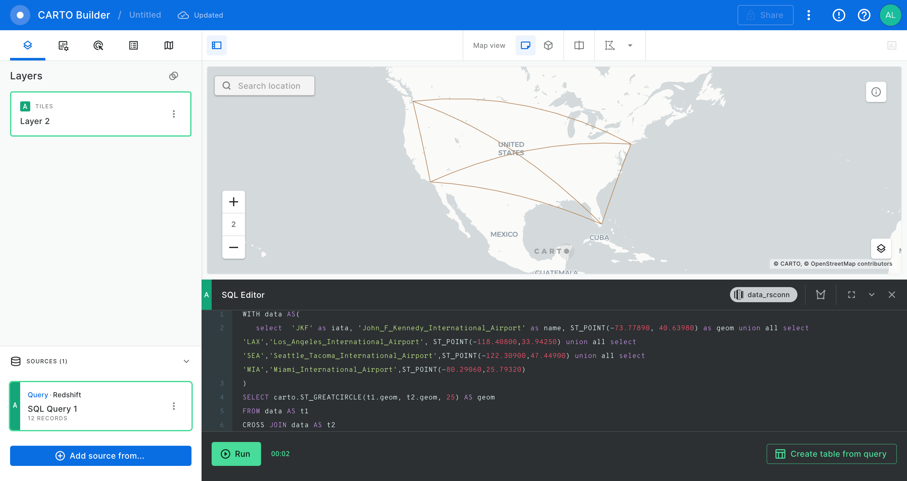 WITH data AS( SELECT * FROM mydatabase.myschema.table ) SELECT t1.column as column1, t2.column as column2, carto.ST_GREATCIRCLE(t1.geom, t2.geom, 25) AS geom FROM data AS t1 CROSS JOIN data AS t2 WHERE t1.column != t2.columnRun the first query. In this example we will showcase how easily we can compute all the paths that interconnect the main four US airports using the Analytics Toolbox.