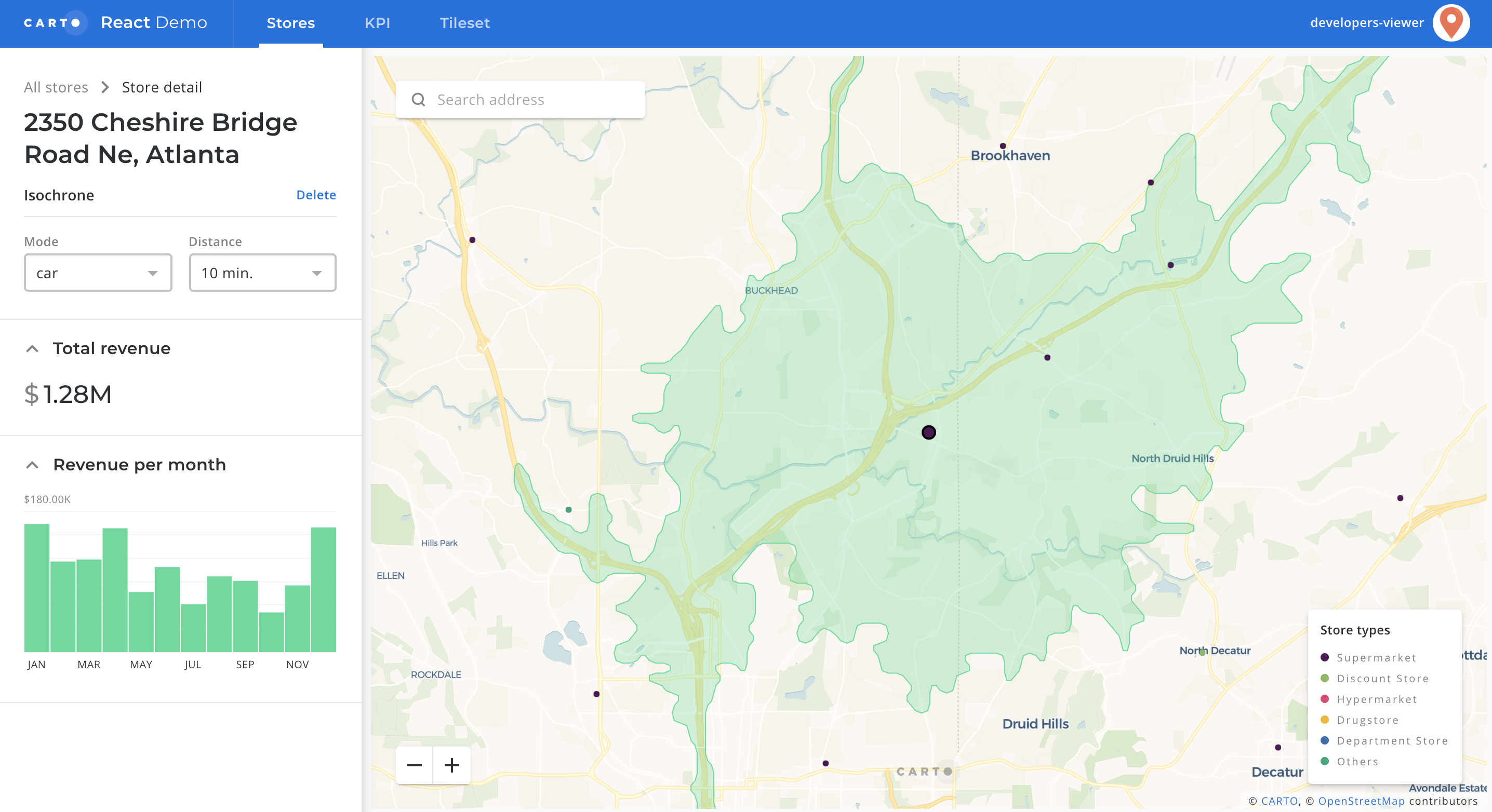 CARTO for React is an application template packed with ready-to-use components to speed up the development of Location Intelligence (LI) Apps using the CARTO platform + React + deck.gl.